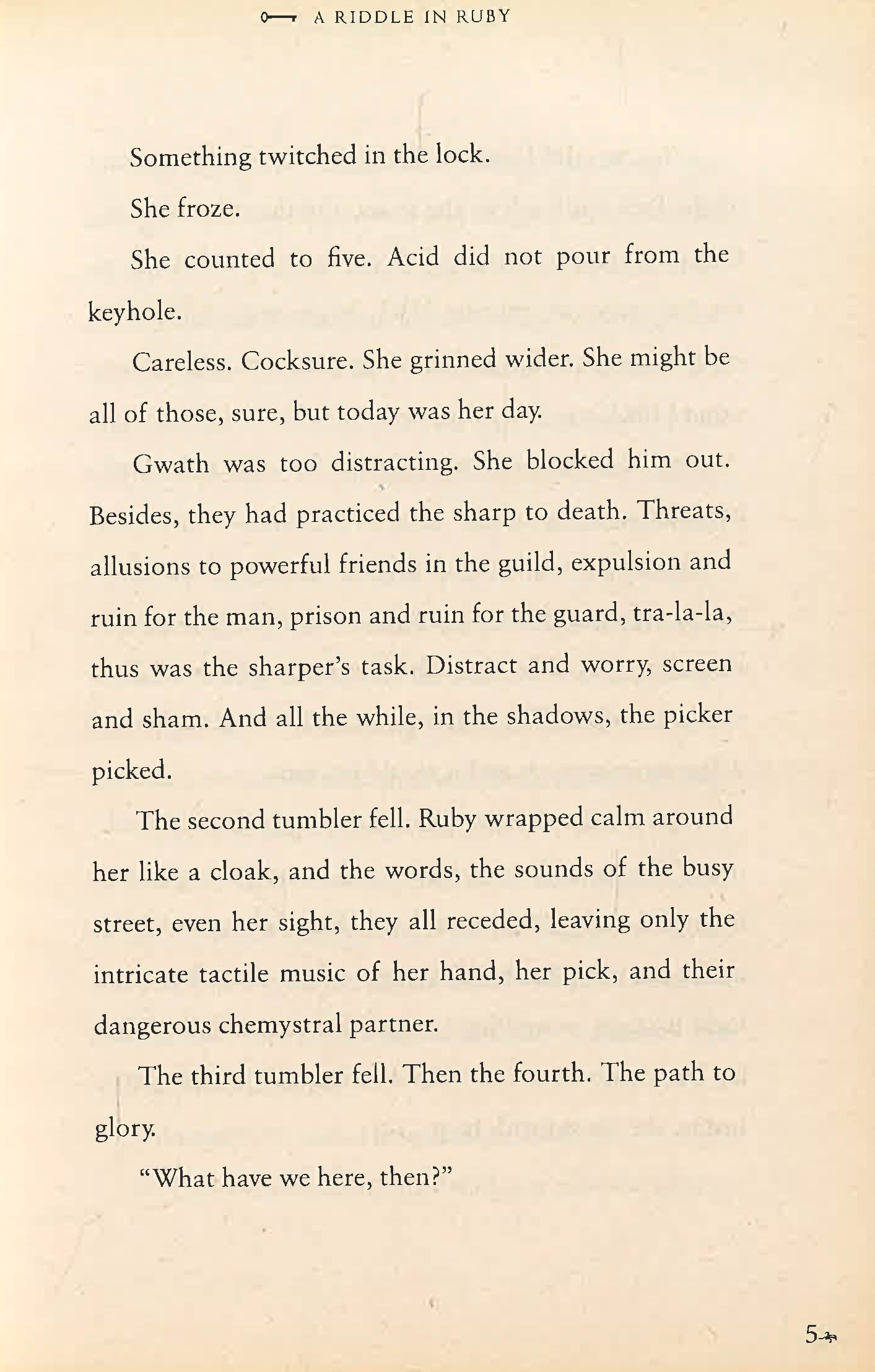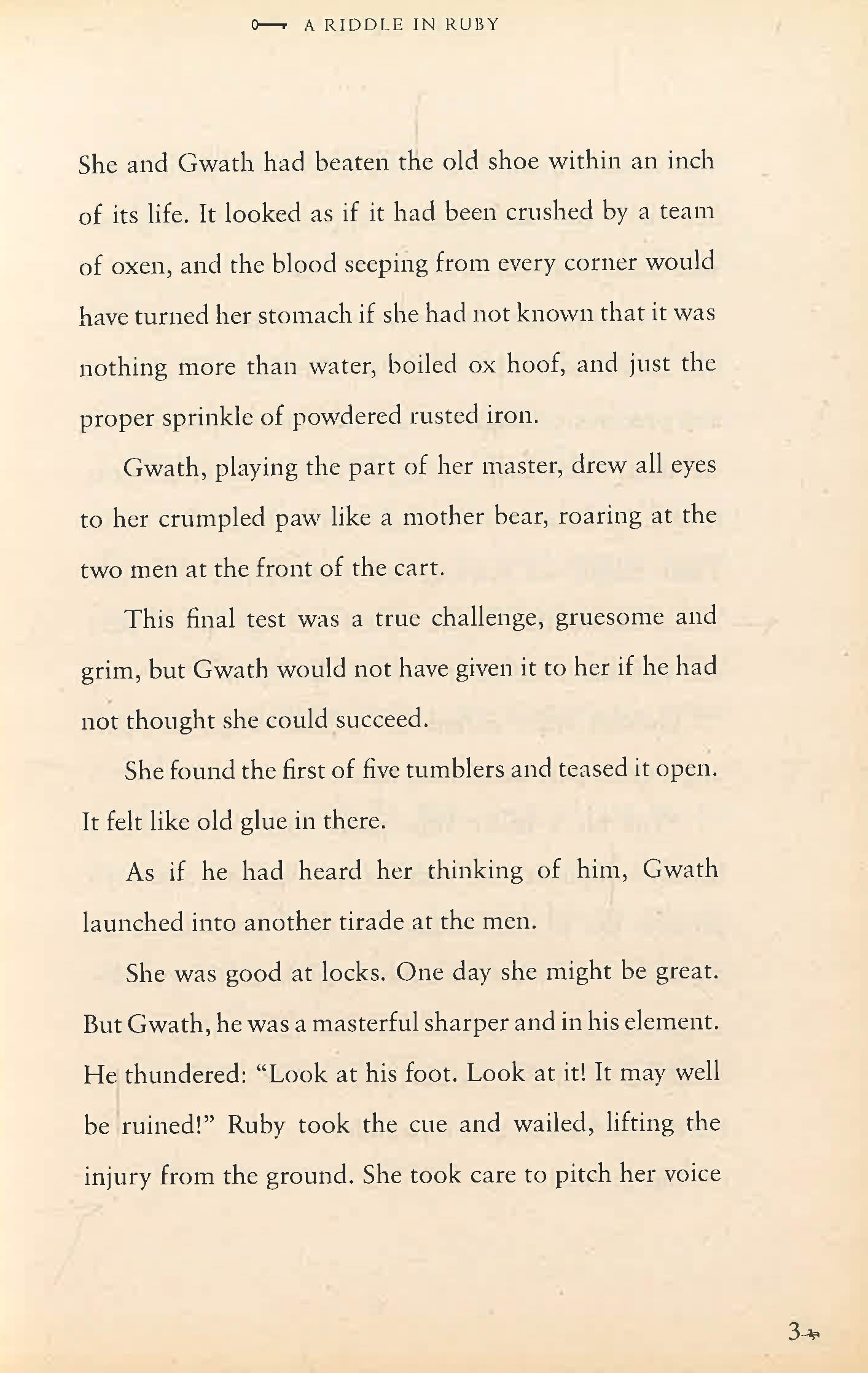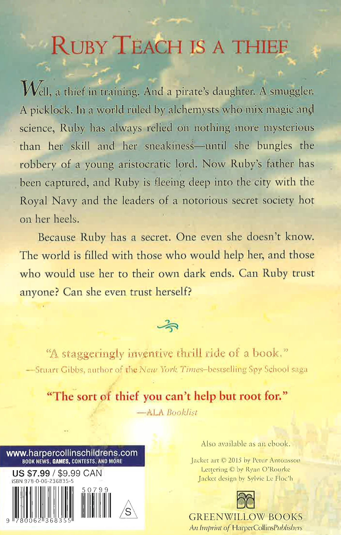 Ruby is a thief-in-training and a keeper of secrets--ones she doesn't even know herself. A Riddle in Ruby is the first book in a witty and fast-paced fantasy-adventure trilogy for fans for Jonathan Stroud, Septimus Heap, and The Very Nearly Honorable League of Pirates.