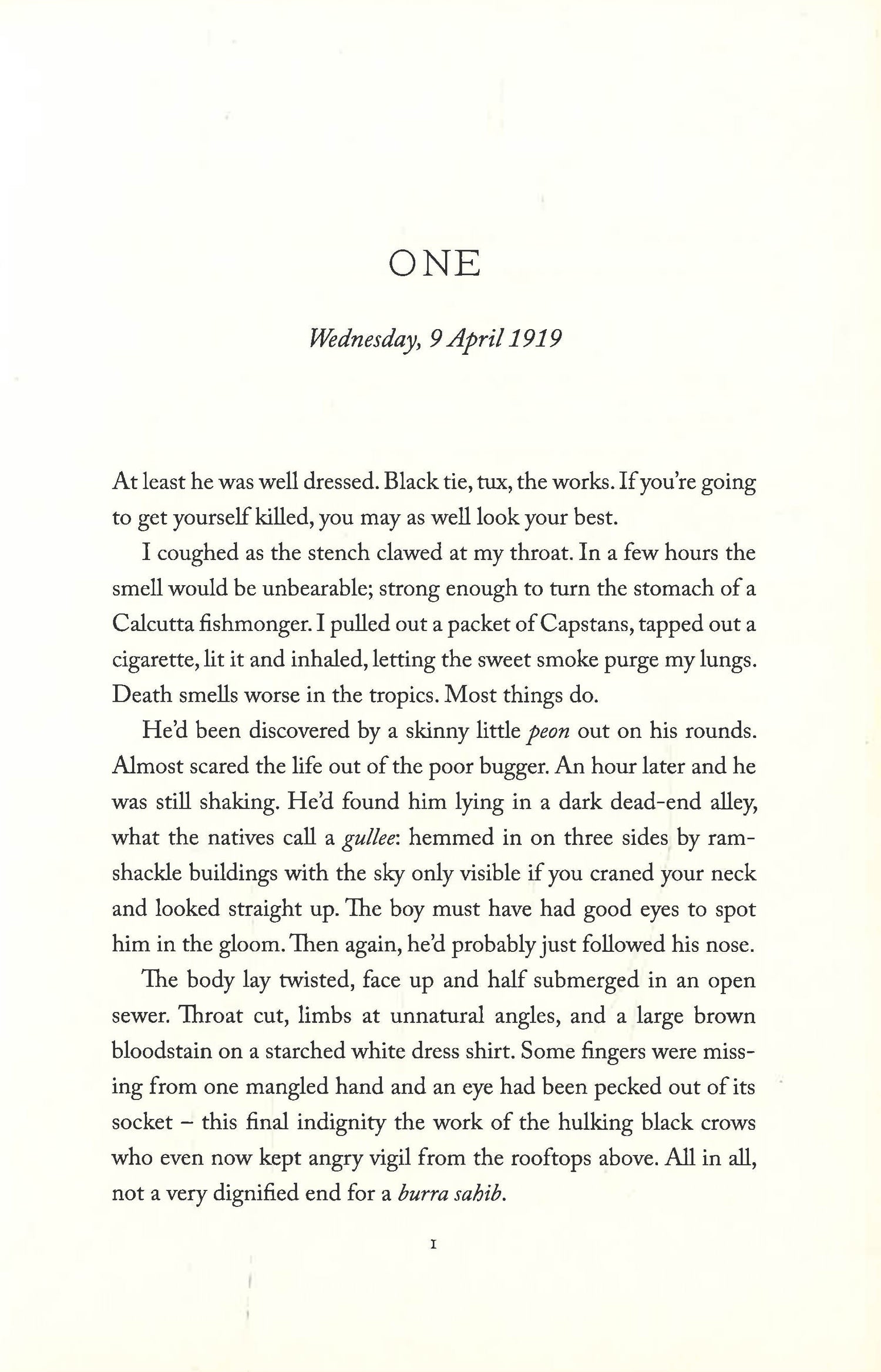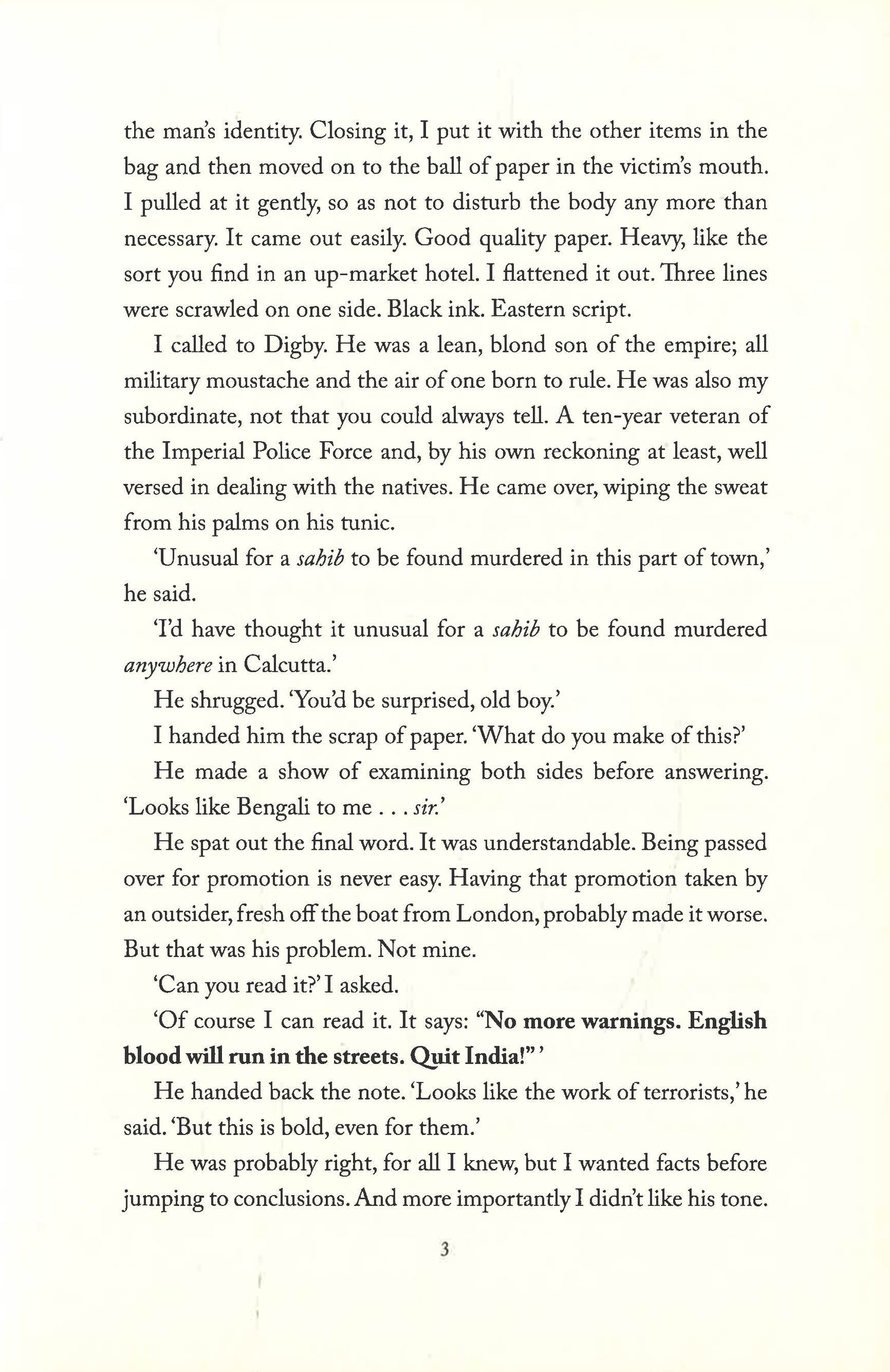 Selected as a Book of the Year 2016 in the Daily TelegraphThe winner of the Harvill Secker/Daily Telegraph crime writing competitionCaptain Sam Wyndham, former Scotland Yard detective, is a new arrival to Calcutta. Desperately seeking a fresh start after his experiences during the Great War, Wyndham has been recruited to head up a new post in the police force. But with barely a moment to acclimatise to his new life or to deal with the ghosts which still haunt him, Wyndham is caught up in a murder investigation that will take him into the dark underbelly of the British Raj.A senior official has been murdered, and a note left in his mouth warns the British to quit India: or else. With rising political dissent and the stability of the Raj under threat, Wyndham and his two new colleagues - arrogant Inspector Digby and British-educated, but Indian-born Sergeant Banerjee, one of the few Indians to be recruited into the new CID - embark on an investigation that will take them from the luxurious parlours of wealthy British traders to the seedy opium dens of the city.The start of an atmospheric and enticing new historical crime series.