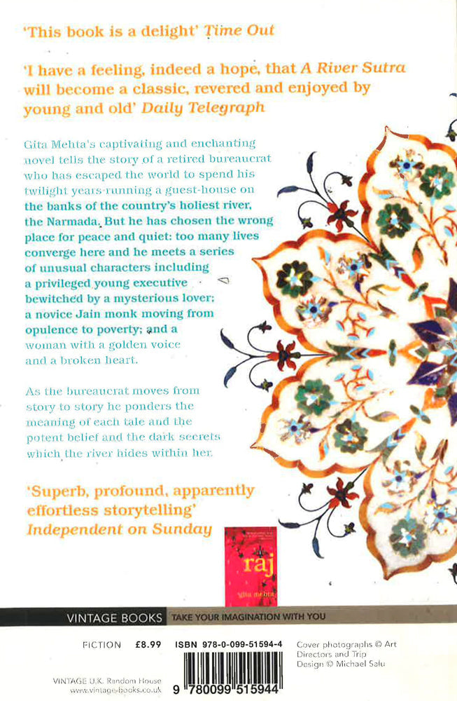 Gita Mehta's captivating and enchanting novel tells the story of a retired beurocrat who has escaped the world to spend his twilight years running a guest-house on the banks of the country's holiest river, the Narmada. Gita Mehta's captivating and enchanting novel tells the story of a retired beurocrat who has escaped the world to spend his twilight years running a guest-house on the banks of the country's holiest river, the Narmada. But he has chosen the wrong place for peace and quiet: too many lives converge here and he meets a series of unusual characters including a privileged young executive bewitched by a mysterious lover; a novice Jain monk moving from opulence to poverty; and a woman with a golden voice and a broken heart.As the beurocrat moves from story to story he ponders the meaning of each tale and the potent belief and the dark secrets which the river hides within her.