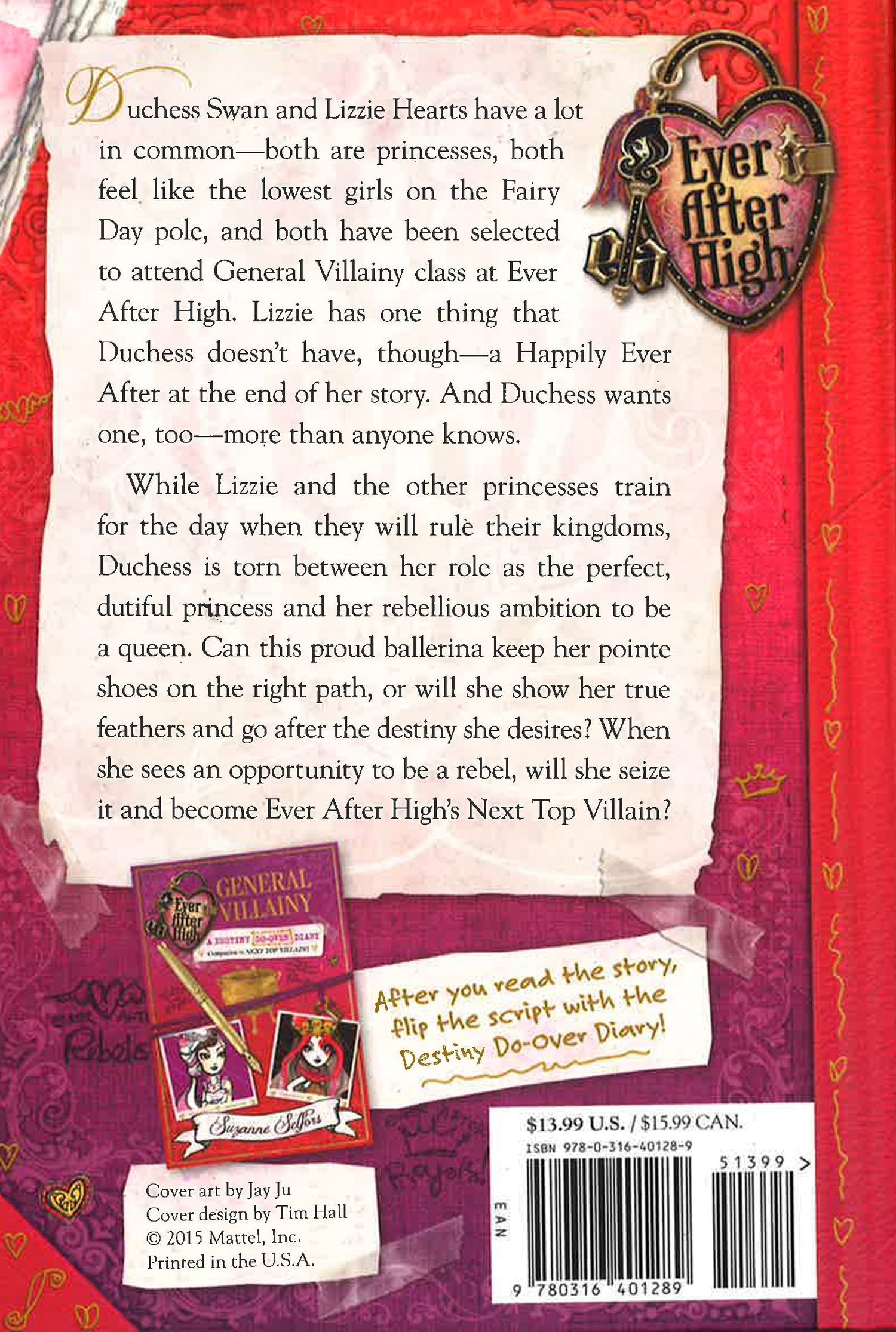 A brand-new series of school stories from the world of Ever After High! Duchess Swan and Lizzie Hearts are roommates at Ever After High. While their personalities are very different, they bond over not quite fitting in with the other Royals. Lizzie, however, has one thing that Duchess doesn't: a happily-ever-after at the end of her story. While Lizzie and the other princesses train for the day when they will rule their kingdoms, Duchess is torn between her role as the perfect, dutiful princess and her rebellious ambition to be a queen. When both girls are selected to attend General Villainy class, Duchess sees an opportunity to be a rebel while following the rules. But can she play a prank on her roomie to ace the class? Find out if Duchess' desire to change her destiny will make her Ever After High's Next Top Villain! Don't miss the companion Destiny Do-Over Diary, General Villainy, for interactive fun!