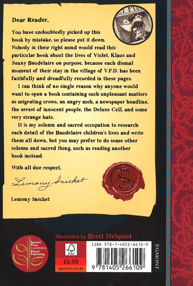 There is nothing to be found in the pages of these books but misery and despair. You still have time to choose something else to read. But if you must know what unpleasantries befall the charming and clever Baudelaire children read on..."The Vile Village": Why would anyone want to open a book containing such unpleasant matters as migrating crows, an angry mob, a newspaper headline, the arrest of innocent people, the Deluxe cell, and some very strange hats.