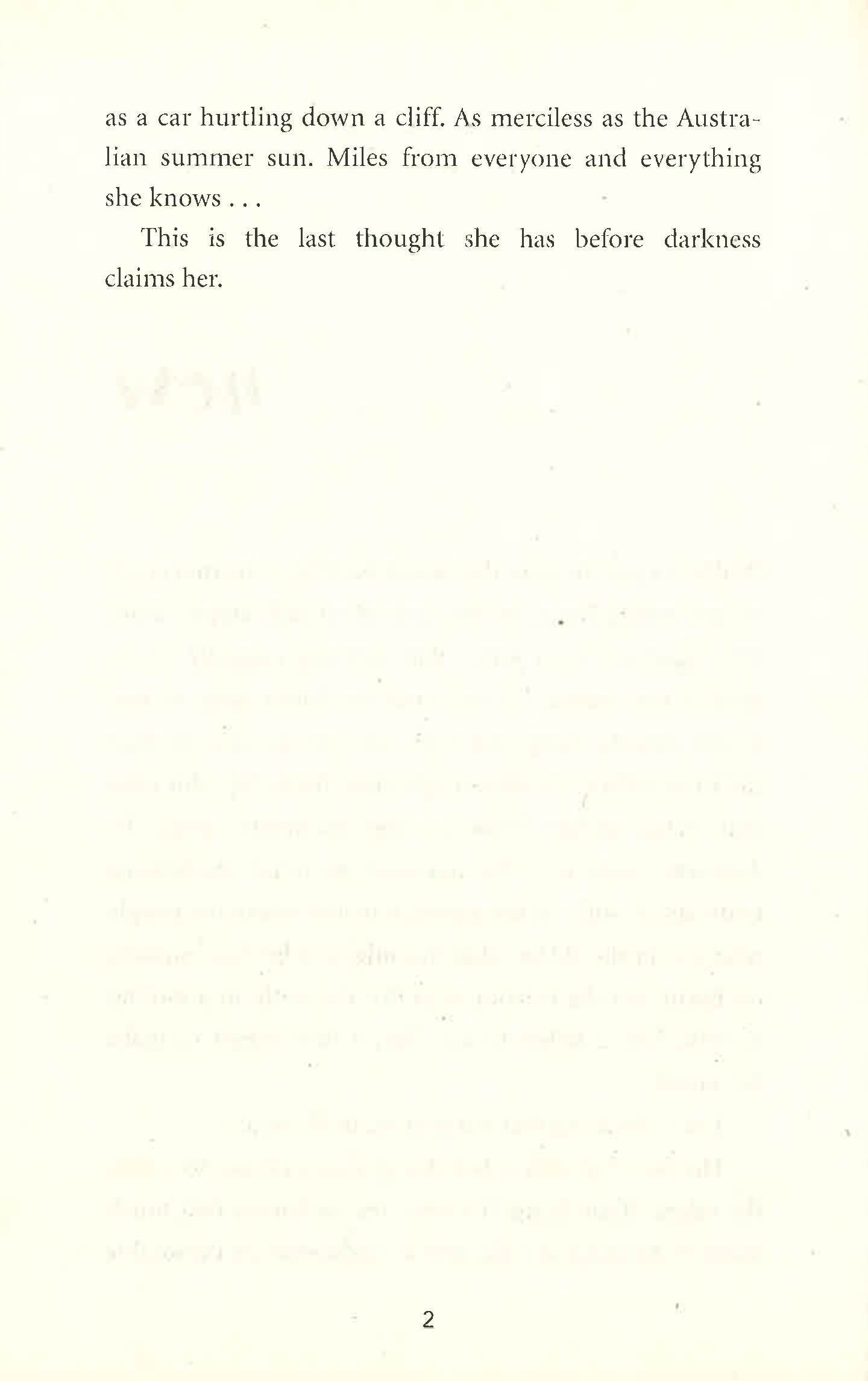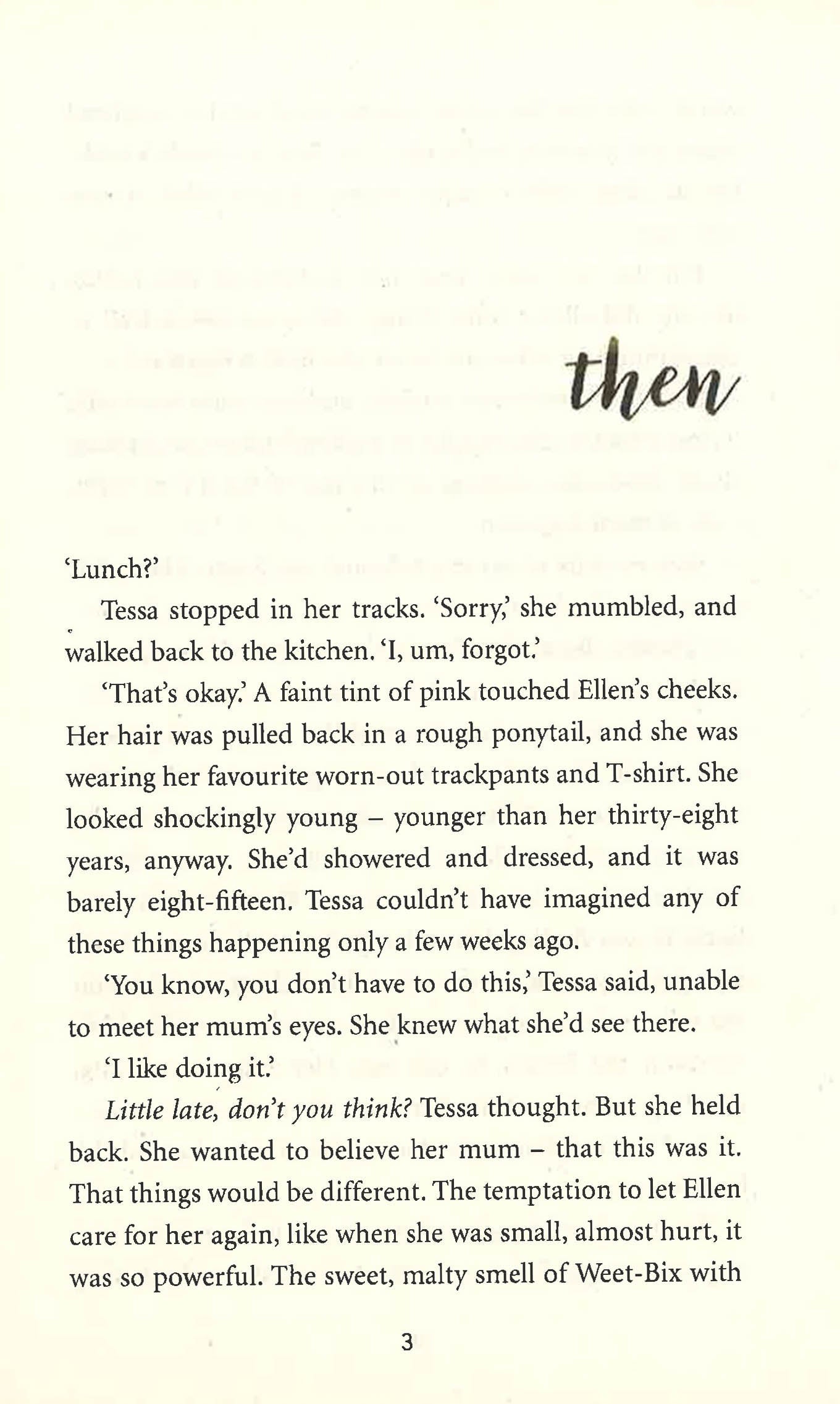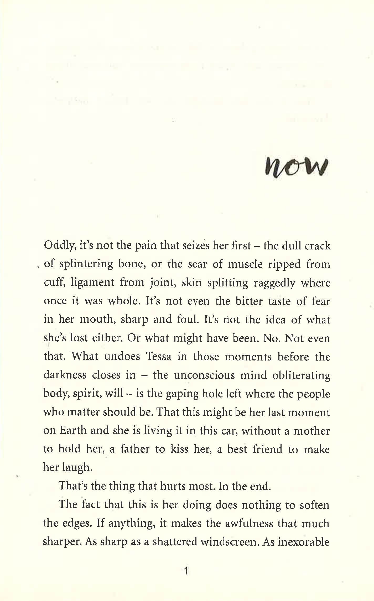 Then, things were looking up for Tessa. Her mum was finally getting back on track. Tessa had started seeing Nick. She was making new friends. She'd even begun to paint again. Now, Tessa and Nick are trapped in the car after a corner taken too fast. Injured, stranded in the wilderness, at the mercy of the elements, the question becomes one of survival. But Tessa isn't sure if she wants to be found. Not after what she saw. Not after what she remembered.