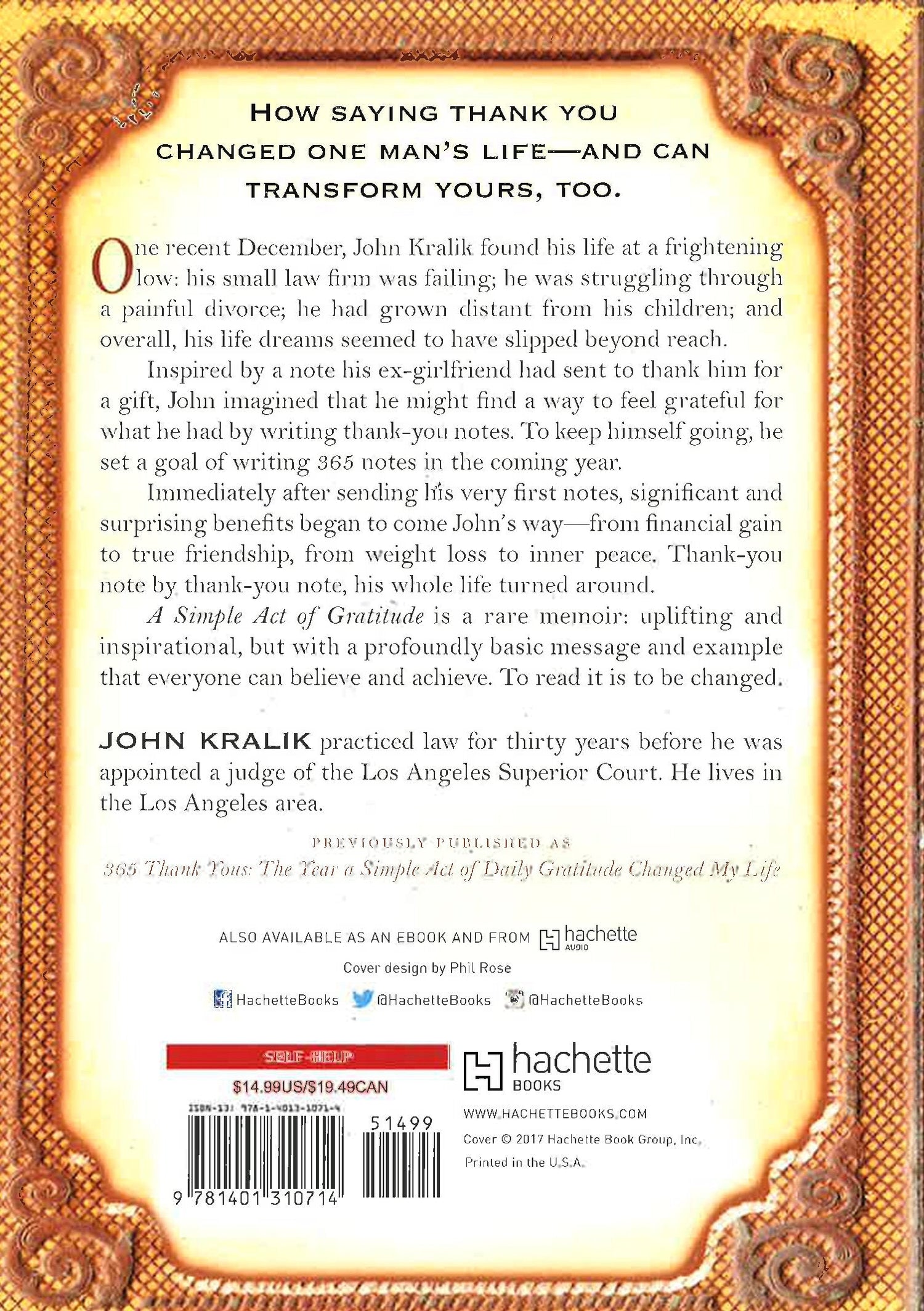 One recent December, at age 53, John Kralik found his life at a terrible, frightening low: his small law firm was failing; he was struggling through a painful second divorce; he had grown distant from his two older children and was afraid he might lose contact with his young daughter; he was living in a tiny apartment where he froze in the winter and baked in the summer; he was 40 pounds overweight; his girlfriend had just broken up with him; and overall, his dearest life dreams--including hopes of upholding idealistic legal principles and of becoming a judge--seemed to have slipped beyond his reach. Then, during a desperate walk in the hills on New Year's Day, John was struck by the belief that his life might become at least tolerable if, instead of focusing on what he didn't have, he could find some way to be grateful for what he had. Inspired by a beautiful, simple note his ex-girlfriend had sent to thank him for his Christmas gift, John imagined that he might find a way to feel grateful by writing thank-you notes. To keep himself going, he set himself a goal--come what may--of writing 365 thank-you notes in the coming year. One by one, day after day, he began to handwrite thank yous--for gifts or kindnesses he'd received from loved ones and coworkers, from past business associates and current foes, from college friends and doctors and store clerks and handymen and neighbors, and anyone, really, absolutely anyone, who'd done him a good turn, however large or small. Immediately after he'd sent his very first notes, significant and surprising benefits began to come John's way--from financial gain to true friendship, from weight loss to inner peace. While John wrote his notes, the economy collapsed, the bank across the street from his office failed, but thank-you note by thank-you note, John's whole life turned around. "A Simple Act of Gratitude" is a rare memoir: its touching, immediately accessible message--and benefits--come to readers from the plainspoken storytelling of an ordinary man. Kralik sets a believable, doable example of how to live a miraculously good life. To read "A Simple Act of Gratitude" is to be changed.