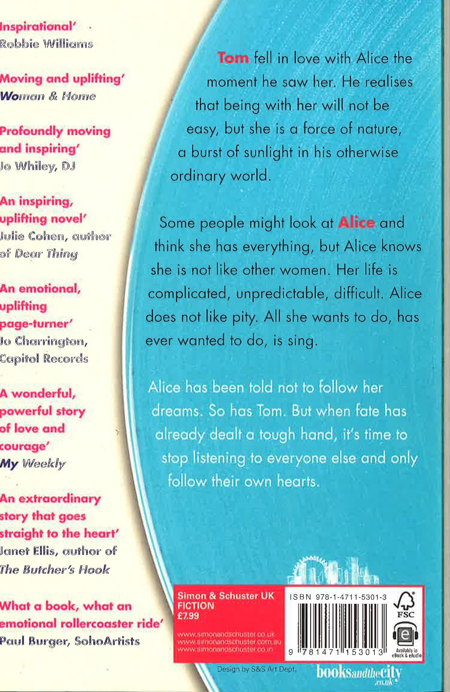 Tom fell in love with Alice the moment he saw her. He realises that being with her will not be easy, but she is a force of nature, a burst of sunlight in his otherwise ordinary world. Some people might look at Alice and think she has everything, but Alice knows she is not like other women. Her life is complicated, unpredictable, difficult. Alice does not like pity. All she wants to do - all she's ever wanted to do - is sing. Alice has been told not to follow her dreams. So has Tom. But when fate has already dealt a tough hand, it's time to stop listening to everyone else and follow their hearts . . .