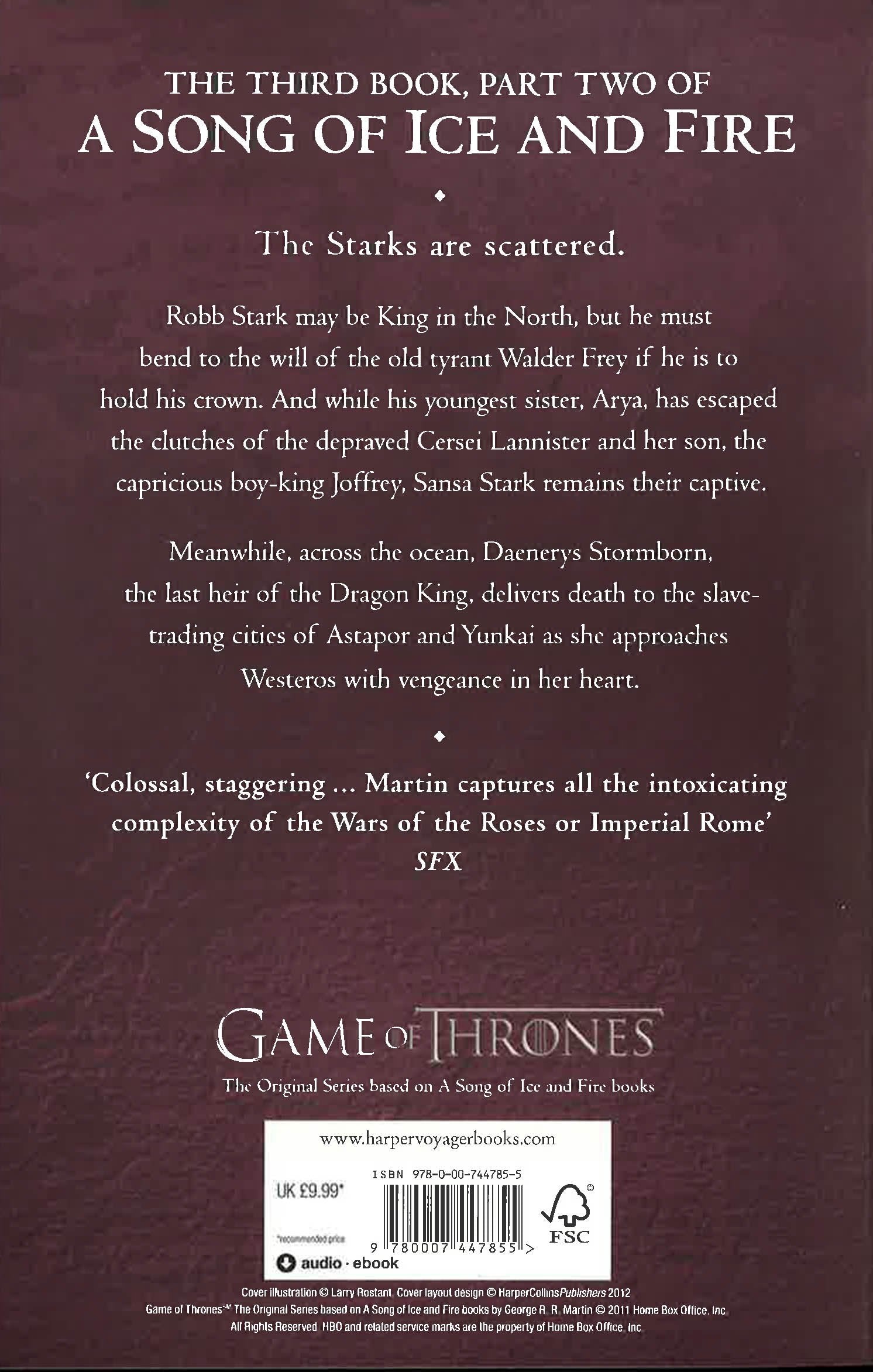 The Starks are scattered. Robb Stark may be King in the North, but he must bend to the will of the old tyrant Walder Frey if he is to hold his crown. And while his youngest sister, Arya, has escaped the clutches of the depraved Cersei Lannister and her son, the capricious boy-king Joffrey, Sansa Stark remains their captive. Meanwhile, across the ocean, Daenerys Stormborn, the last heir of the Dragon King, delivers death to the slave-trading cities of Astapor and Yunkai as she approaches Westeros with vengeance in her heart.