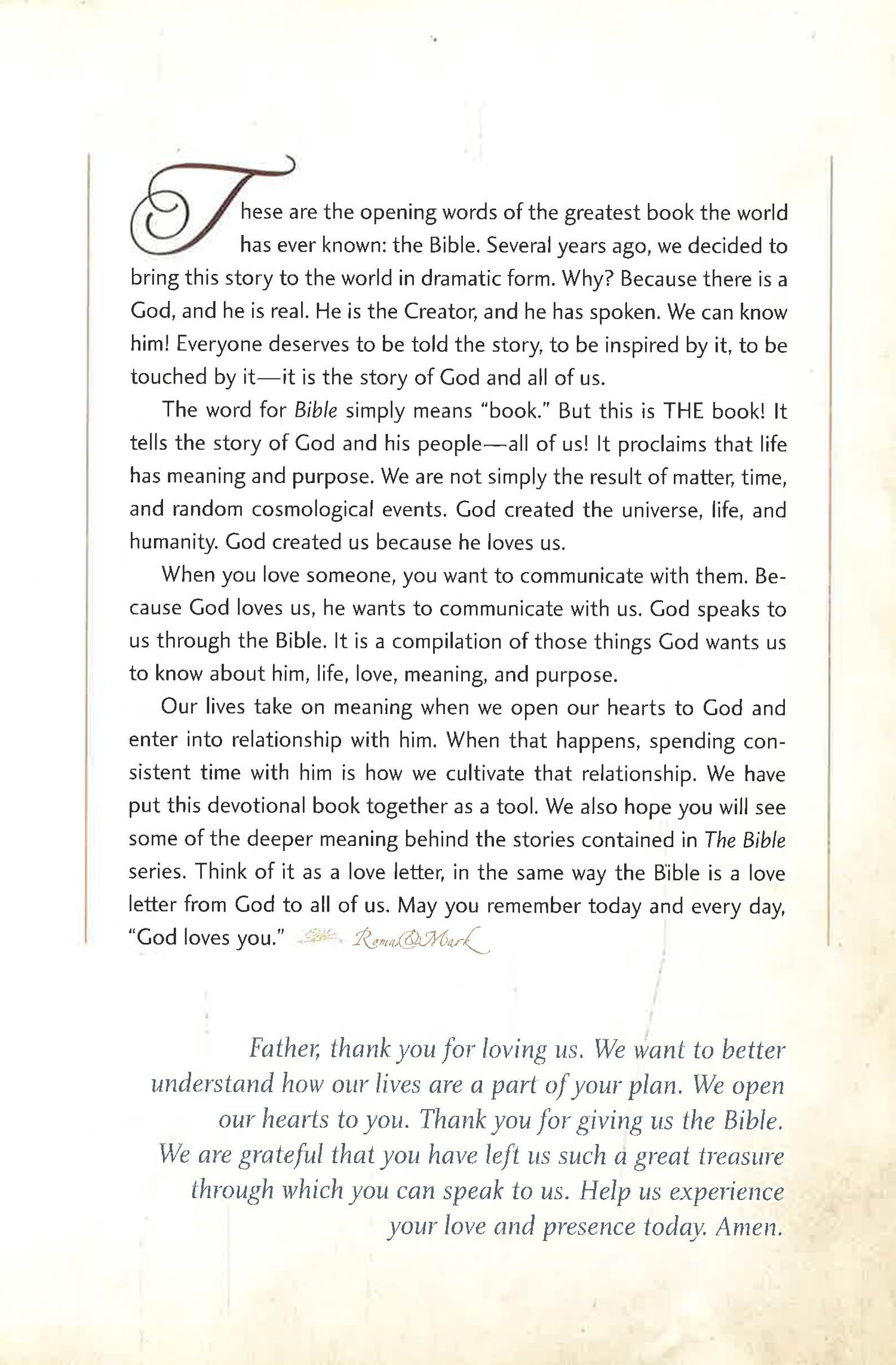 This gorgeous, high-design book of 100 daily inspirations will help you to experience God's love through the text of the Bible. Each reflection includes a Bible verse, a personal reading, and a short prayer with visually stunning images from the set of the epic TV Miniseries, "The Bible."