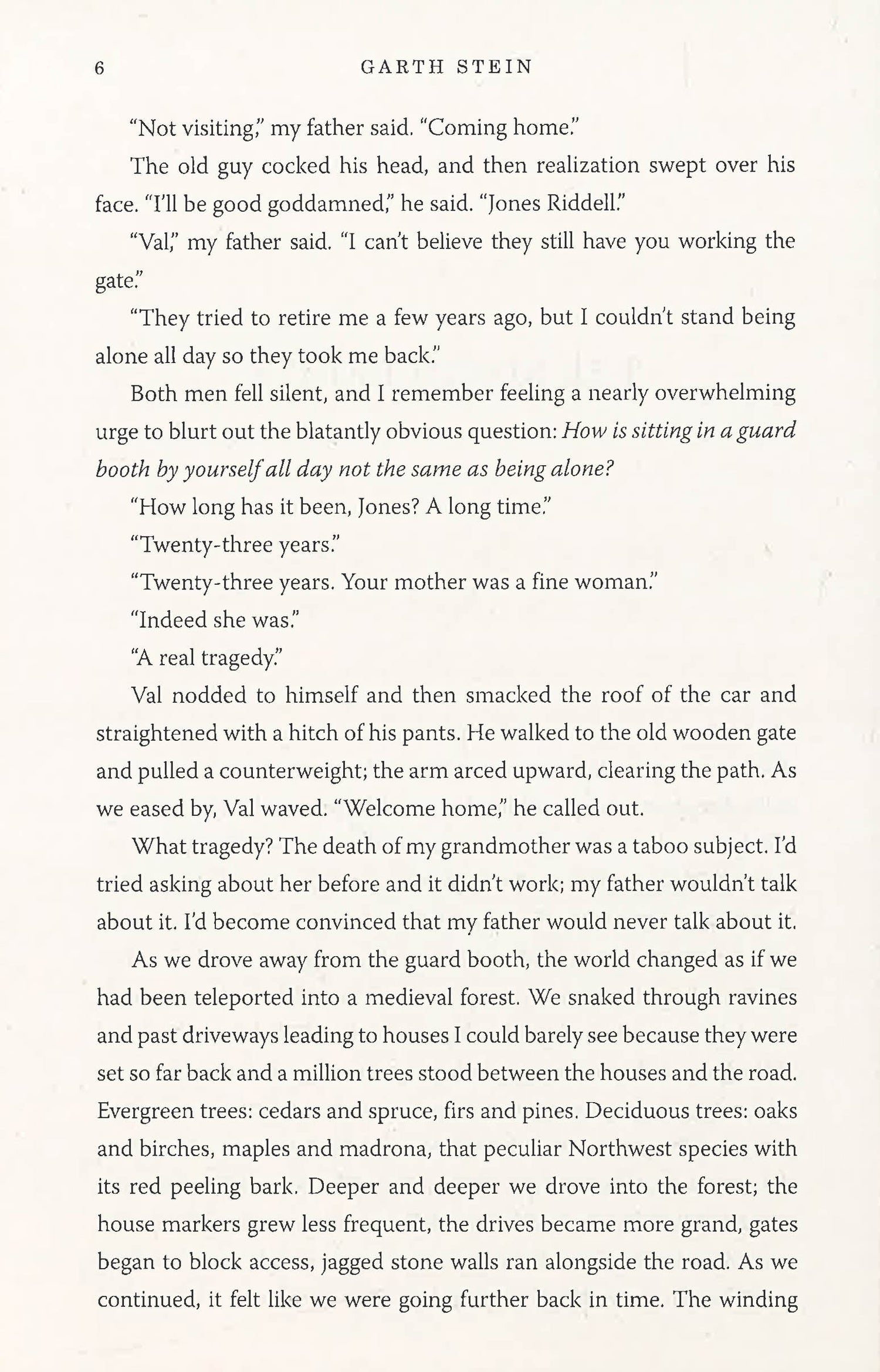 The "New York Times "bestselling witty, atmospheric ("People") story of a once powerful American family, and the price that must be paid by the heirs as they struggle for redemption: A captivating page-turner ("Star Tribune," Minneapolis). Twenty-three years after the fateful summer of 1990, Trevor Riddell recalls the events surrounding his fourteenth birthday, when he gets his first glimpse of the infamous Riddell House. Built from the spoils of a massive timber fortune, the legendary family mansion is constructed of giant whole trees and is set on a huge estate overlooking Seattle s Puget Sound. Trevor s bankrupt parents have separated, and his father, Jones Riddell, has brought Trevor to Riddell House with a goal: to join forces with Aunt Serena, dispatch the ailing and elderly Grandpa Samuel to a nursing home, sell off the house and property for development, and divide up the profits. But as young Trevor explores the house s hidden stairways and forgotten rooms, he discovers secrets that convince him that the family plan may be at odds with the land s true destiny. Only Trevor s willingness to face the dark past of his forefathers will reveal the key to his family s future. Spellbinding and atmospheric, "A Sudden Light" is rich with vivid characters, poetic scenes of natural beauty, and powerful moments of spiritual transcendence. Garth Stein is resourceful, cleverly piecing together the family history with dreams, overheard conversations, and reminiscences a tale well told, ("The Seattle Times") a triumphant work of a master storyteller at the height of his power. *This book may have remainder mark*