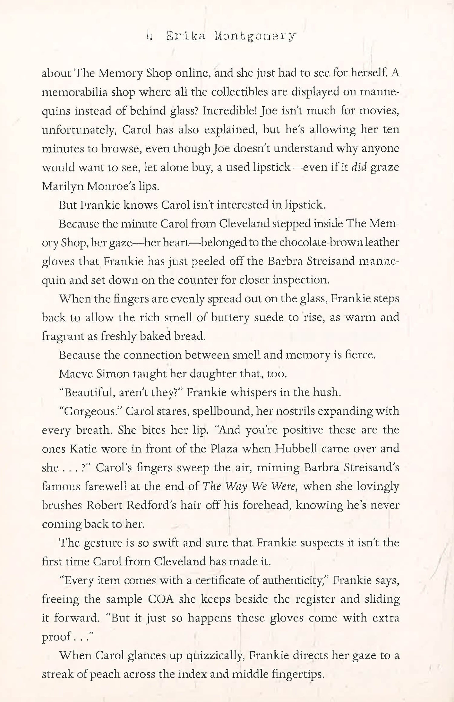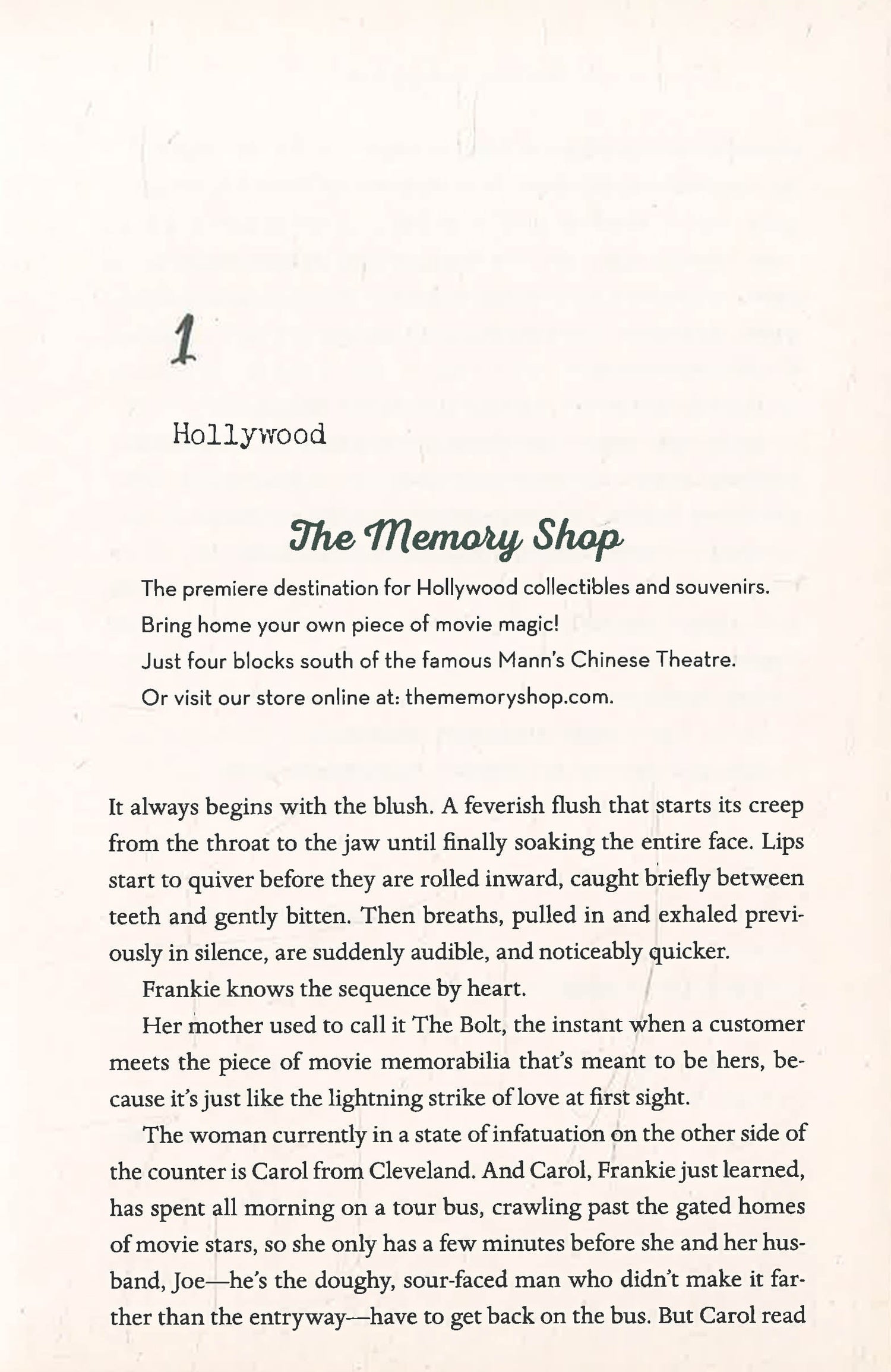 For thirty-year-old Frankie Simon, selling movie memorabilia in the shop she opened with her late mother on Hollywood Boulevard is more than just her livelihood―it’s an enduring connection to the only family she has ever known. But when a mysterious package arrives containing a photograph of her mother and famous movie stars Glory Cartwright and her husband at a coastal film festival the year before Frankie’s birth, her life begins to unravel in ways unimaginable.