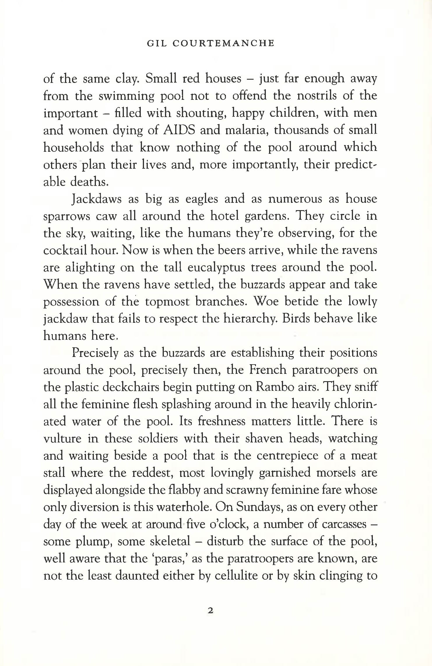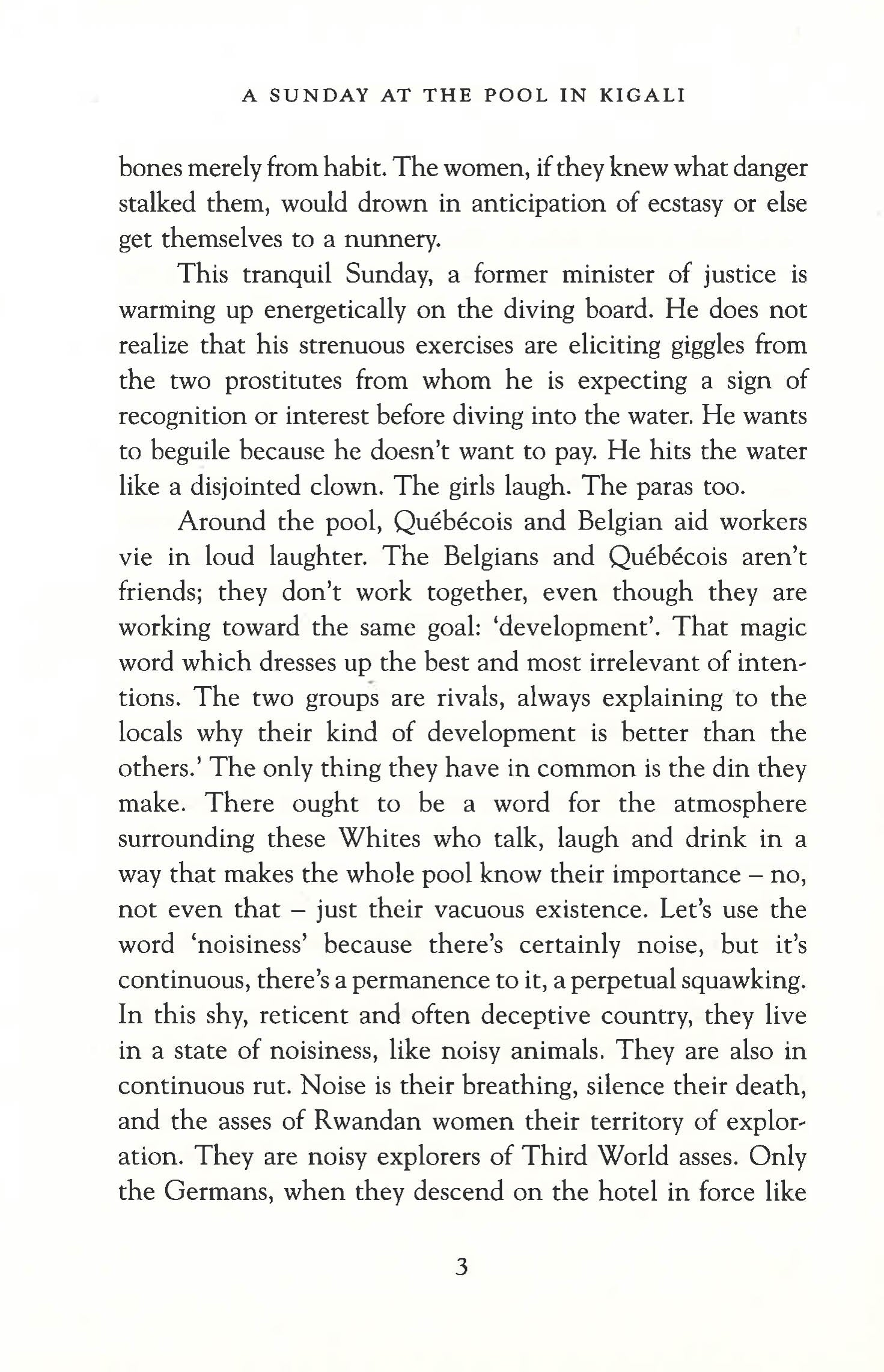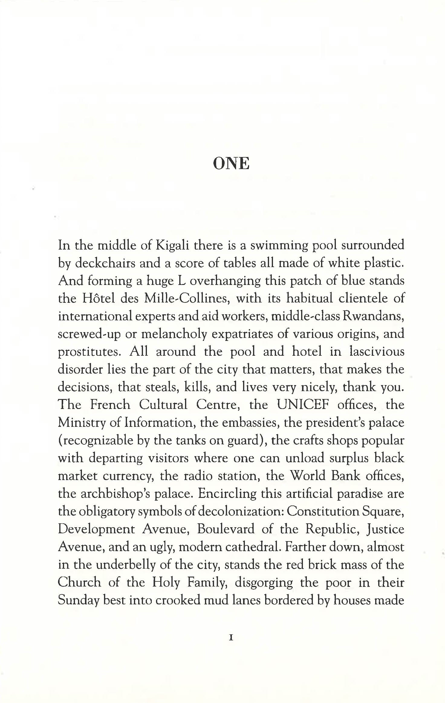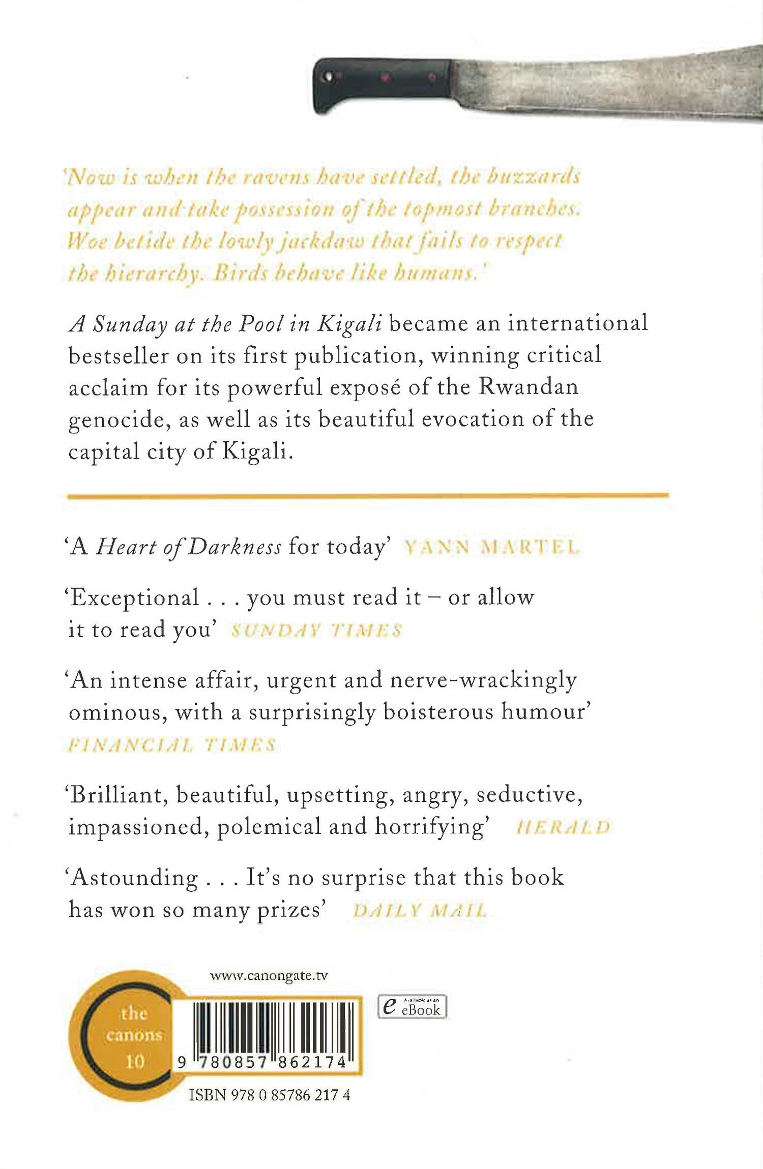 The Hotel des Mille-Collines is a magnet for a privileged group of residents living in Kigali. As civil unrest threatens what little order remains in the city, Valcourt, a Canadian journalist, falls for a beautiful Hutu waitress, Gentille. When news of the trouble reaches the hotel, both Valcourt and Gentille speak out against the brutal attacks, but are met with apathetic UN forces, corrupt policemen and the blindness of western media. A Sunday at the Pool in Kigali is a powerful political novel, a poignant love story and a stirring hymn to humanity.