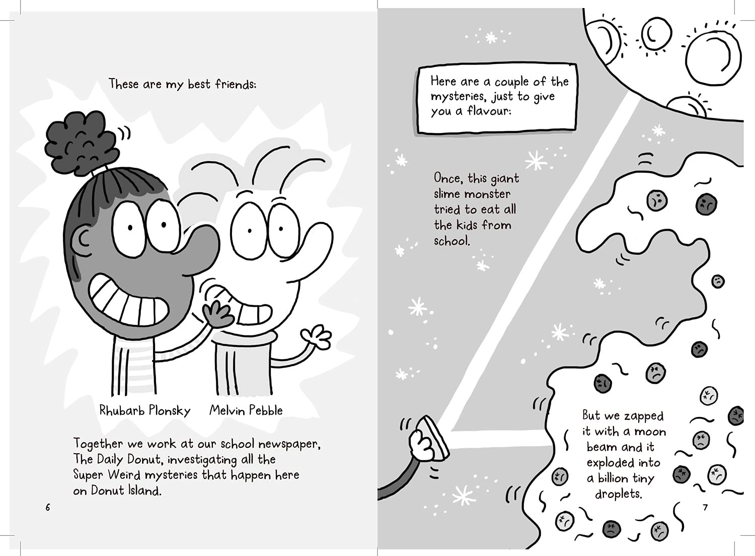 Melvin, Rhubarb and Yoshi love solving super weird mysteries and writing about them in their newspaper, The Daily Donut. But lately nothing super weird has been happening, and all they've had to write about is super boring stuff, like Yoshi’s dad’s smelly eraser collection.