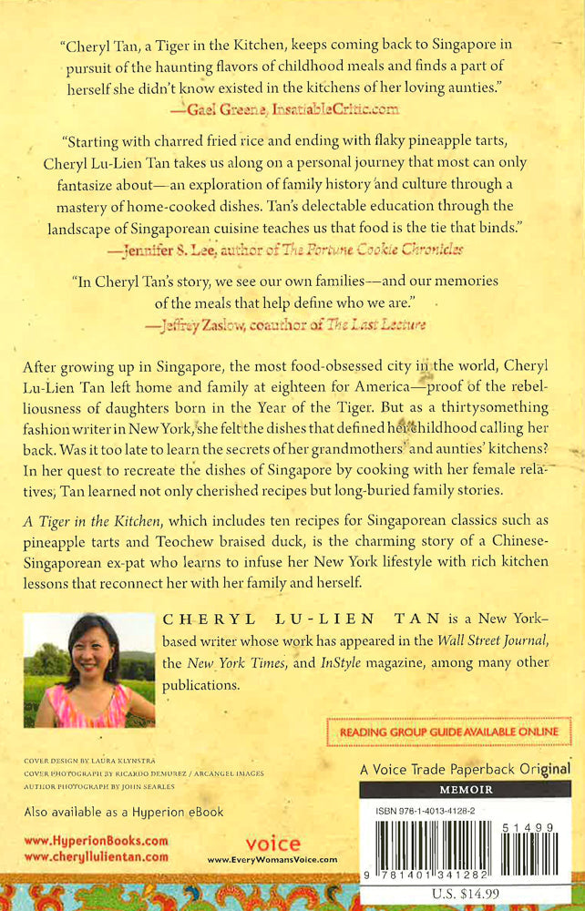 After growing up in the most food-obsessed city in the world, Cheryl Lu-Lien Tan left home and family at eighteen for America -proof of the rebelliousness of daughters born in the Year of the Tiger. But as a thirtysomething fashion writer in New York, she felt the Singaporean dishes that defined her childhood beginning to call her back. Was it too late to learn the secrets of her grandmothers' and aunties' kitchens, as well as the tumultuous family history that had kept them hidden before? In her quest to recreate the dishes of her native Singapore by cooking with her family, Tan learned not only cherished recipes but long-buried stories of past generations. A Tiger in the Kitchen, which includes ten authentic recipes for Singaporean classics such as pineapple tarts and Teochew braised duck, is the charming, beautifully written story of a Chinese-Singaporean ex-pat who learns to infuse her New York lifestyle with the rich lessons of the Singaporean kitchen, ultimately reconnecting with her family and herself.