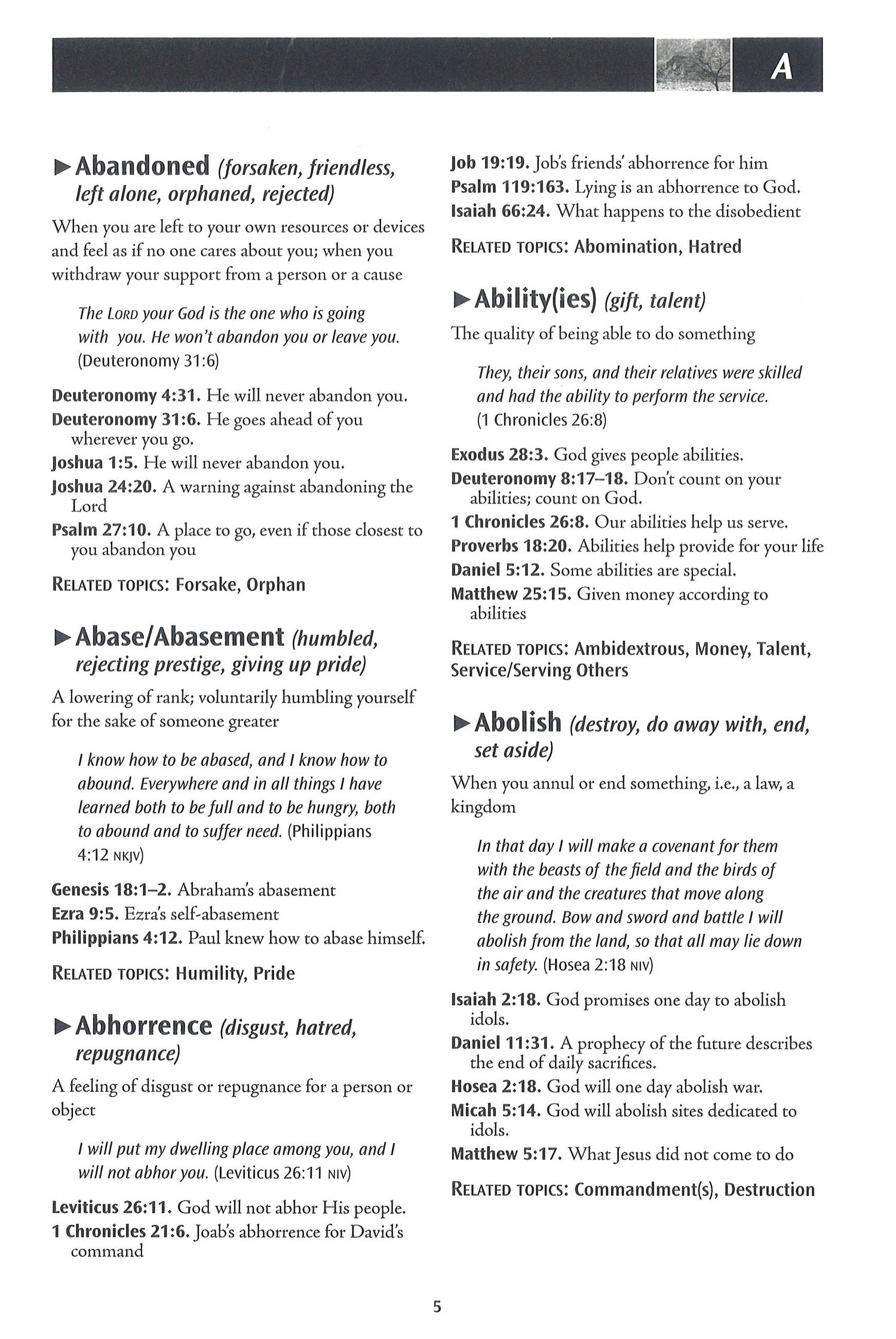 This practical, applicable, and easy-to-use reference tool offers an "at your fingertips" guide to key Scripture references, Bible stories, and verses that relate to topics like -anger -controversy -employment -going green -happiness -leadership -money -relaxation -sex -worship. Even topics off the beaten path, such as UFOs, pistachios, and insomnia are covered. An excellent resource for pastors, speakers, and writers, this collection is produced by Livingstone, whose products have won 11 ECPA Gold Medallion awards.