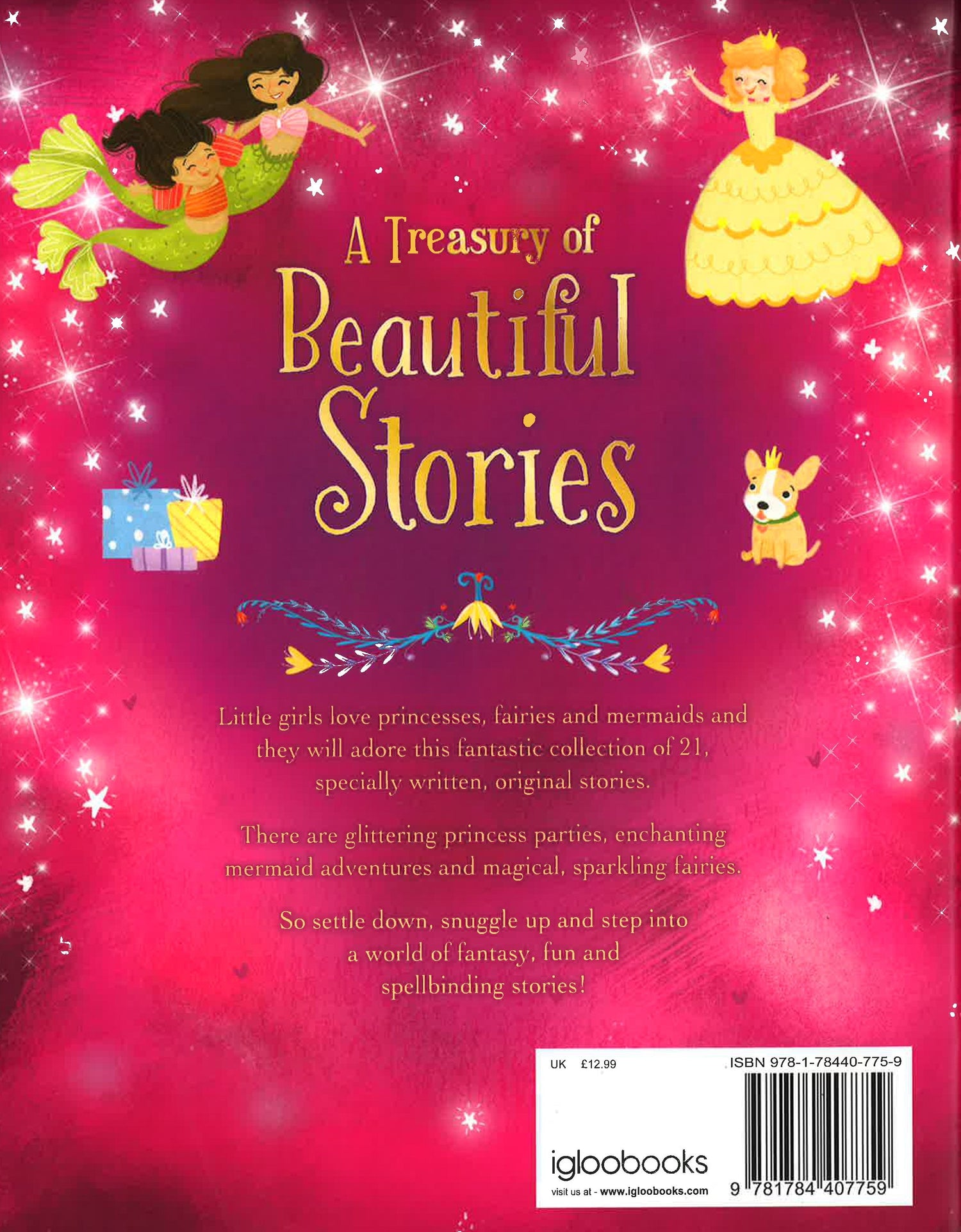 Little girls love princesses, fairies and mermaids and they will adore this fantastic collection of 21 specially written, original stories. There are glittering princess parties, enchanting mermaid adventures and magical, sparkling fairies. So settle down, snuggle up and step into a world of fantasy, fun and spellbinding stories! Filled with both classic tales as well as brand new stories. Bright, imaginative artwork to catch children's attention. Includes titles that are suitable for both boys and girls. Beautiful Stories includes 21 stories filled with princesses, fairies, ballerinas and mermaids that young girls are sure to love.
