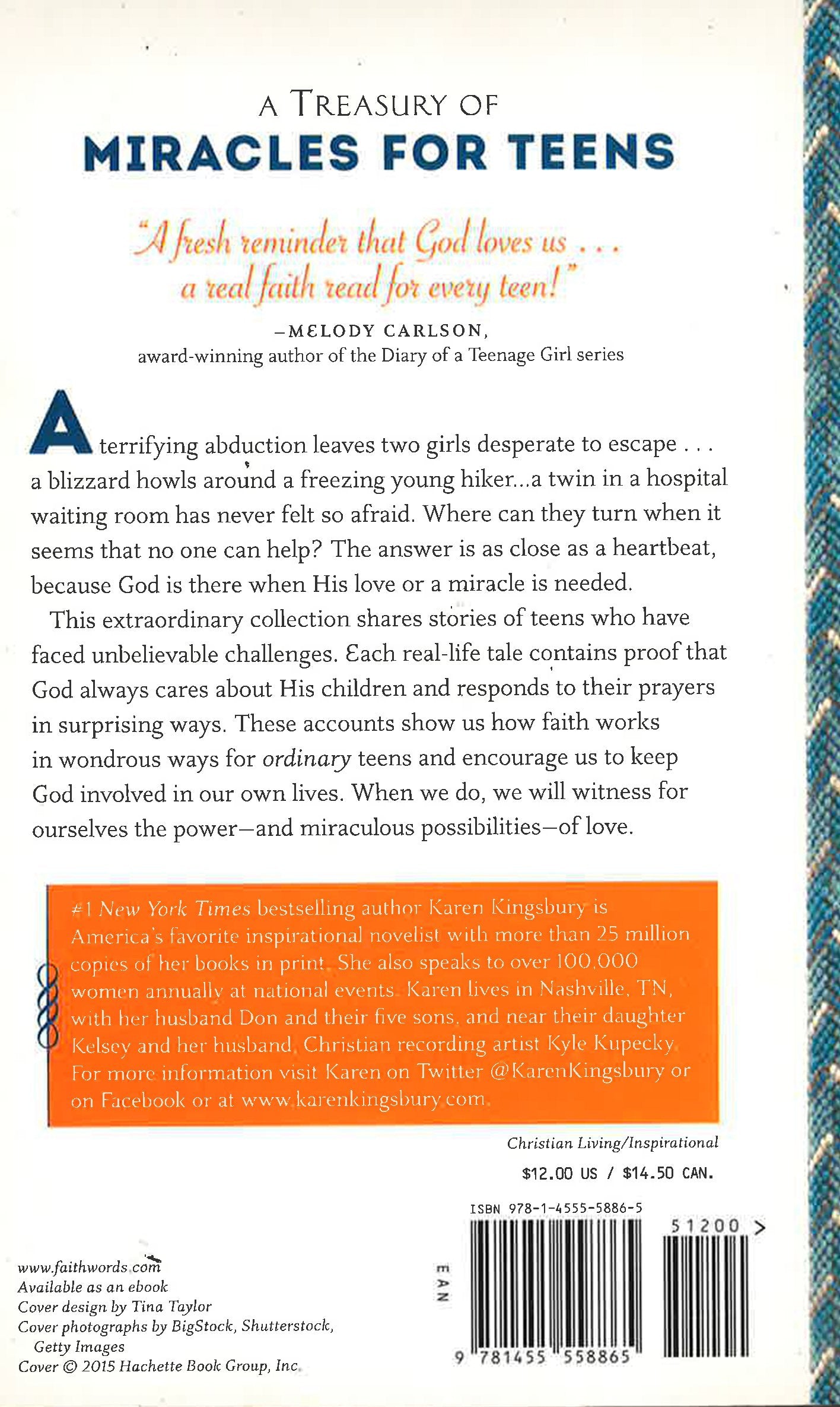 A terrifying abduction leaves two girls desperate to escape. . . a blizzard howls around a freezing young hiker. . . a twin in a hospital waiting room has never felt so afraid. . . . Where can they turn when it seems that nothing, no one, can help them? The answer is as close as a heartbeat, because God is always there when we need his love - or a miracle.In this extraordinary book, New York Times bestselling author Karen Kingsbury brings together the stories of teens who have faced unbelievable challenges. Each real-life tale contains proof that God cares about us all the time and responds to our prayers, often in surprising ways. Filled with amazing true stories for and about teens, this uplifting collection shows us that we are never alone, not even in the darkest hours when life takes the most astonishing turns.