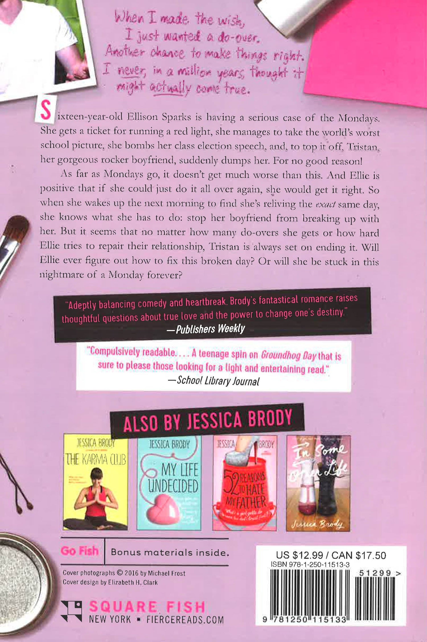 Sixteen-year-old Ellison Sparks is having a serious case of the Mondays. She gets a ticket for running a red light, she manages to take the world’s worst school picture, she bombs softball try-outs and her class election speech (note to self: never trust a cheerleader when she swears there are no nuts in her bake-sale banana bread), and to top it all off, Tristan, her gorgeous rocker boyfriend suddenly dumps her. For no good reason!As far as Mondays go, it doesn’t get much worse than this. And Ellie is positive that if she could just do it all over again, she would get it right. So when she wakes up the next morning to find she’s reliving the exact same day, she knows what she has to do: stop her boyfriend from breaking up with her. But it seems no matter how many do-overs she gets or how hard Ellie tries to repair her relationship, Tristan always seems bent on ending it. Will Ellie ever figure out how to fix this broken day? Or will she be stuck in this nightmare of a Monday forever?