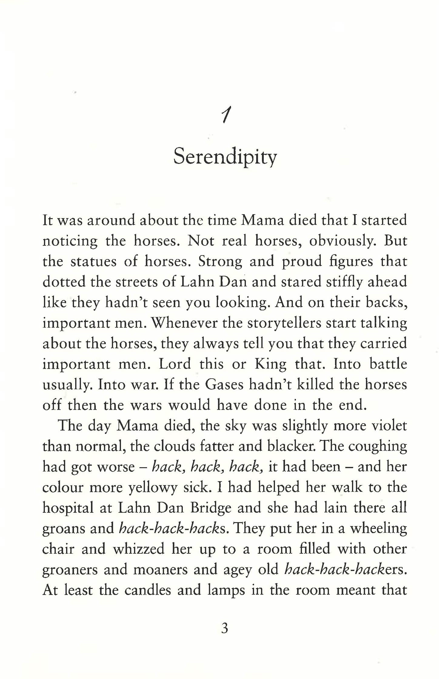 When Mama dies, Seren is taken under the wing of Professor Nimbus, a storyteller. Nimbus is kind and knowledgable, but Seren has started to question the Minister's rule and life beyond the high, impenetrable Emm Twenty-Five wall. Hidden among Mama's few possessions was a map which suggests there is life outside of Lahn Dahn, and a place where horses live and roam freely - out beyond the wall and the Minister's grip. So, with the help of a trader boy called Tab and his little dog Mouse, Serendipity heads into the unknown, searching for the beautiful creatures she's always dreamed of. But the Minister is behind them, determined to hunt her down. . .