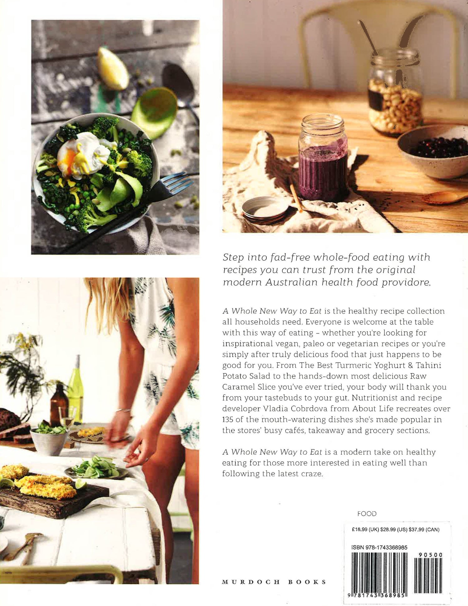 Vladia Cobrdova's food philosophy focuses on the importance of using the best possible natural ingredients, free from chemicals, in tune with the balance of your body and with the seasons. The recipes in A Whole New Way to Eat are the culmination of years of knowledge working as a recipe developer for the cafes at the Australian wholefood stores About Life, combining ingredients to create the perfect balance of health, nutrition and taste. Covering breakfast, drinks, dips & spreads, salads, soups, lunch, dinner, snacks and sweets A Whole New Way to Eat has every realm of eating and drinking covered to get you through the week and introducing a diverse range of foods into your diet. Breakfast inspiration comes in the form of recipes like Kohlrabi and sweet potato rosti with maple bacon and lime avocado paired with a Salted almond butter smoothie and Chia and date porridge; lunch comes with recipes like Crispy coconut chicken; and main meal ideas include dishes of Lamb-stuffed aubergine with lemon & white bean tahini mash and Seafood and black rice paella.There's even sweet treats and snacks to keep you going, from Hazelnut and ginger chocolate fudge bark to Carrot & zucchini cake with ricotta frosting. With inspirational recipes that are suitable for vegans, paleo and vegetarians, A Whole New Way to Eat ensures that everyone is welcome at the table with truly delicious food that just happens to be good for you.