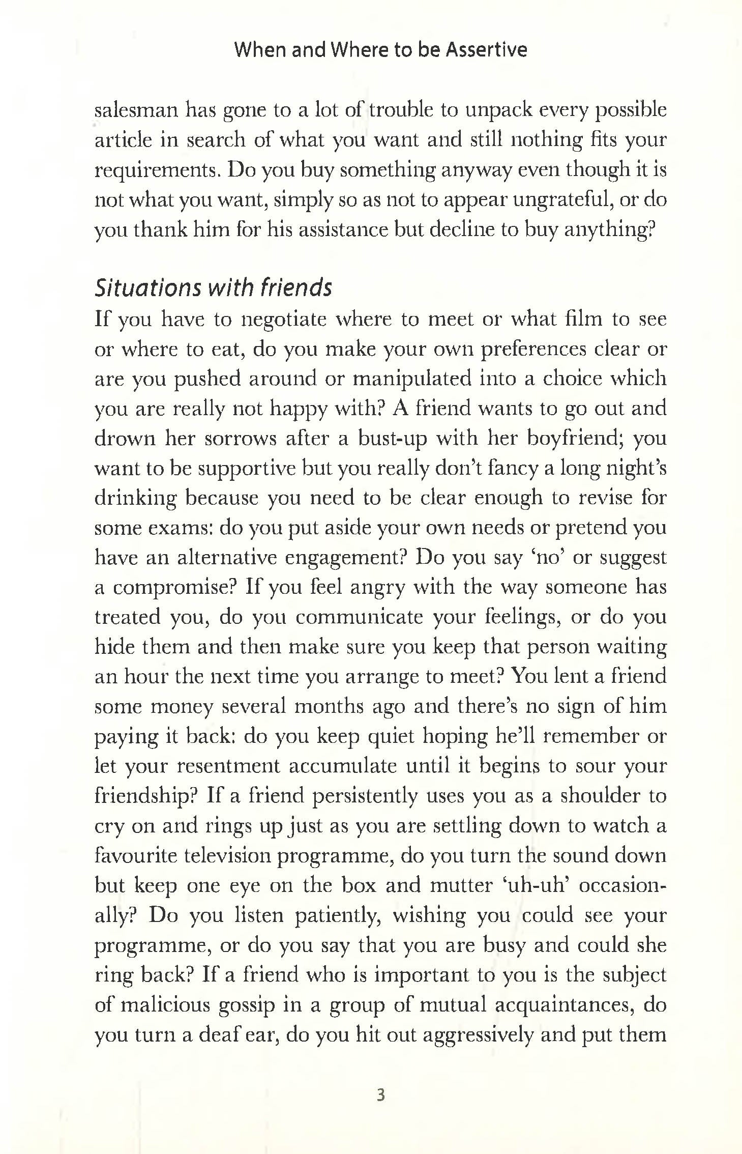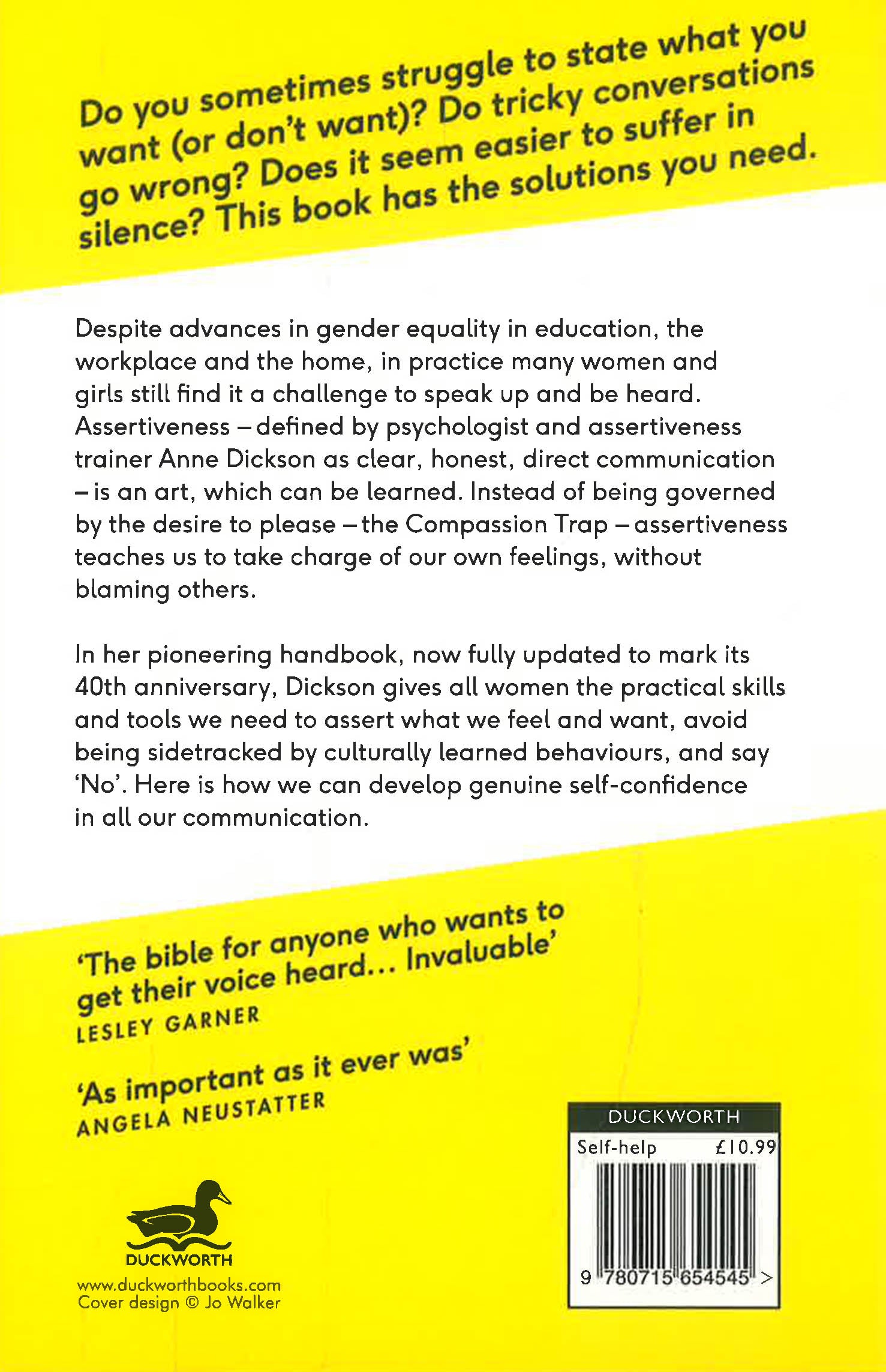 The classic assertiveness bible' GUARDIAN Do you struggle to state what you want (or don’t want)? Do tricky conversations go wrong? Does it seem easier to suffer in silence? This book has the solutions you need. Despite advances in gender equality in education, the workplace and the home, many women and girls still find it a challenge to speak up and be heard. Assertiveness – defined by psychologist and assertiveness trainer Anne Dickson as 'clear, honest and direct communication' – is an art, which can be learned. Instead of being governed by the desire to please (the Compassion Trap) assertiveness teaches us to take charge of our feelings and behaviours. In her pioneering handbook, now fully updated, Dickson draws on her long experience of in-person training to give all women the practical skills and tools we need to assert what we feel and want, manage difficult conversations, avoid being sidetracked, say ‘No’, and find self-acceptance.