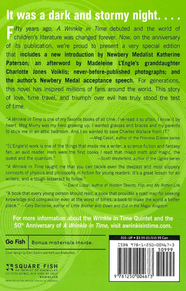 Fifty years ago, Madeleine L'Engle introduced the world to "A Wrinkle in Time" and the wonderful and unforgettable characters Meg and Charles Wallace Murry, and their friend Calvin O'Keefe. When the children learn that Mr. Murry has been captured by the Dark Thing, they time travel to Camazotz, where they must face the leader IT in the ultimate battle between good and evil a journey that threatens their lives and our universe. A Newbery Award winner, "A Wrinkle in Time" is an iconic novel that continues to inspire millions of fans around the world. This special edition has been redesigned and includes an introduction by Katherine Paterson, an afterword by Madeleine L'Engle's granddaughter Charlotte Jones Voiklis that includes photographs and memorabilia, the author's Newbery Medal acceptance speech, and other bonus materials. *This book may have minor shelfwear.