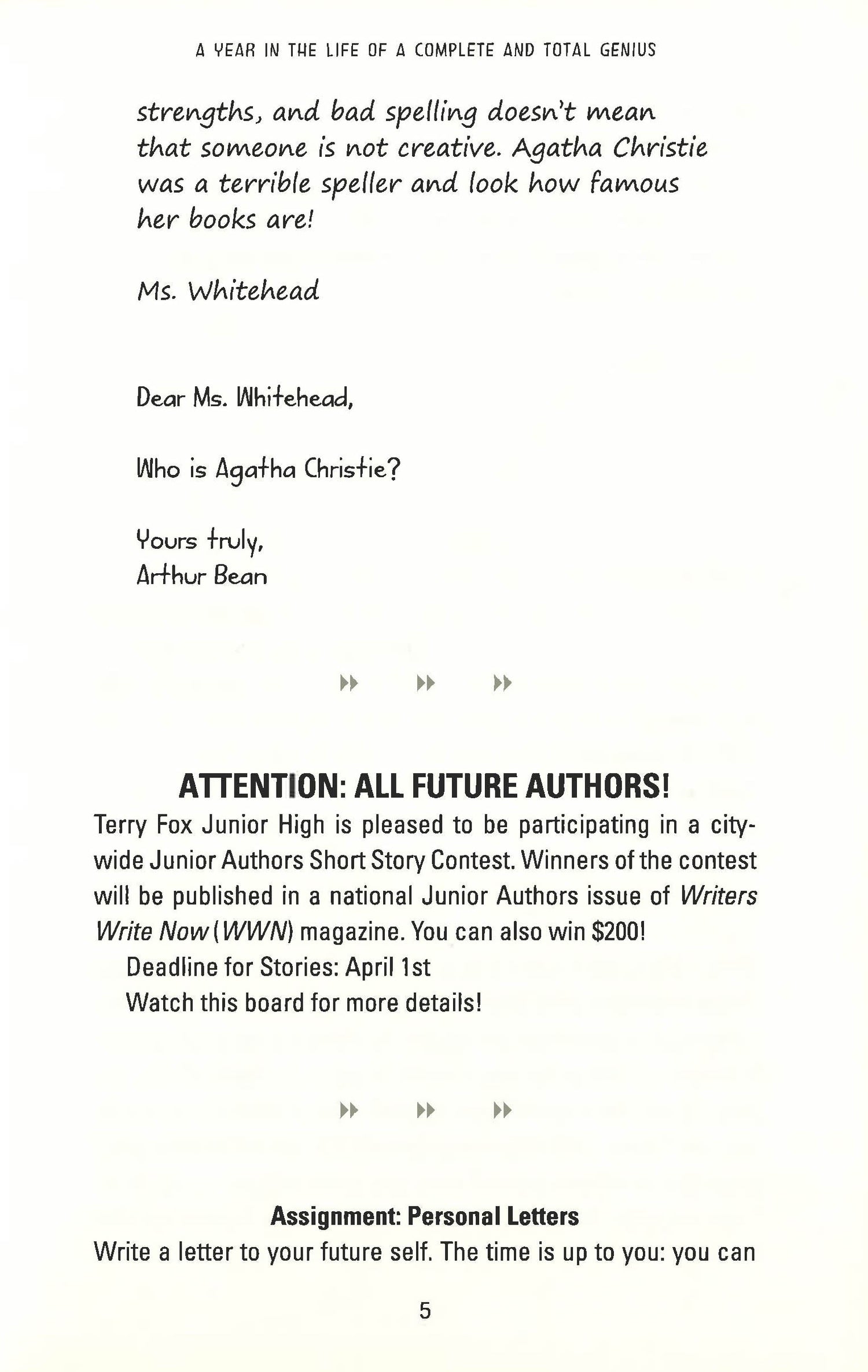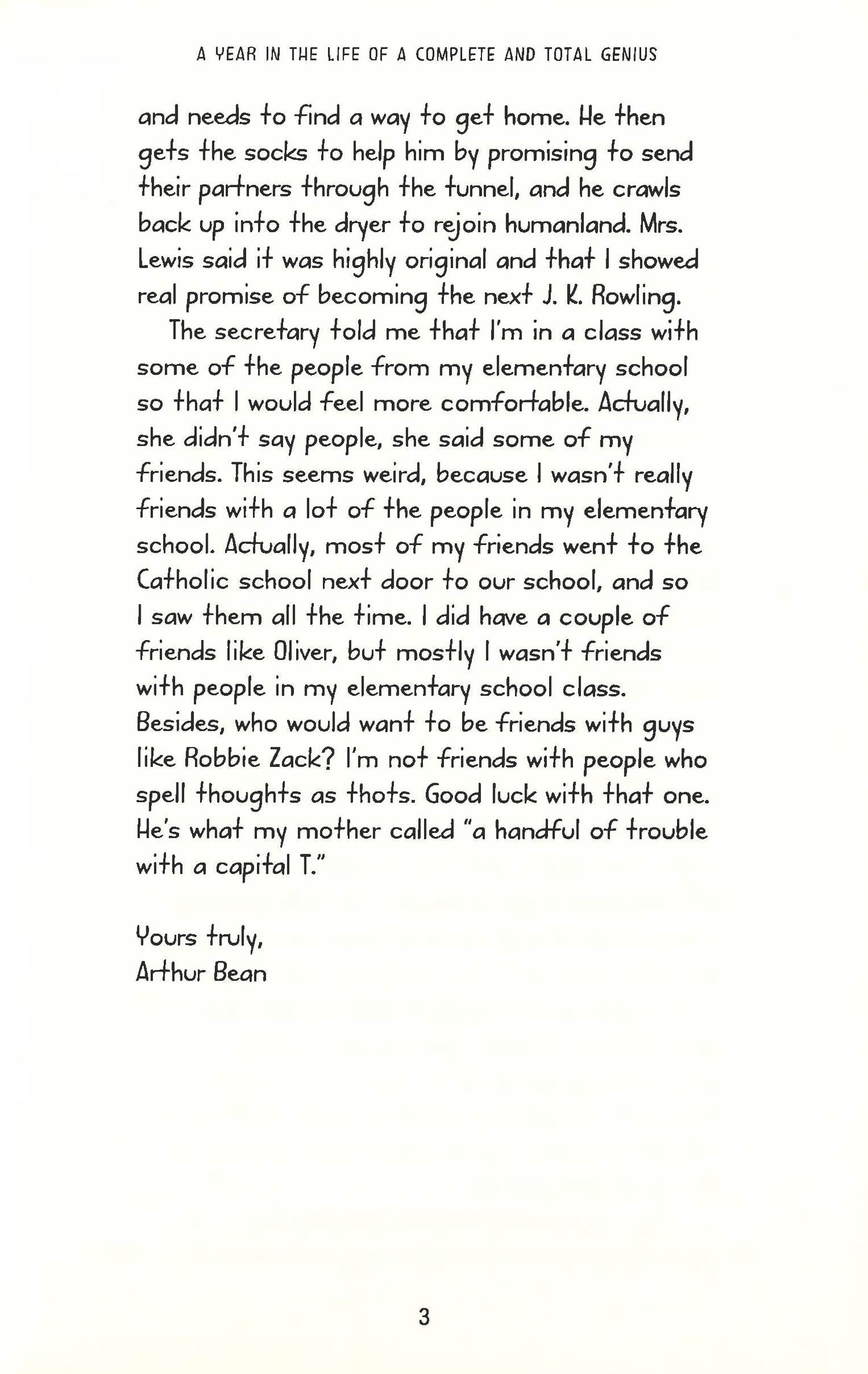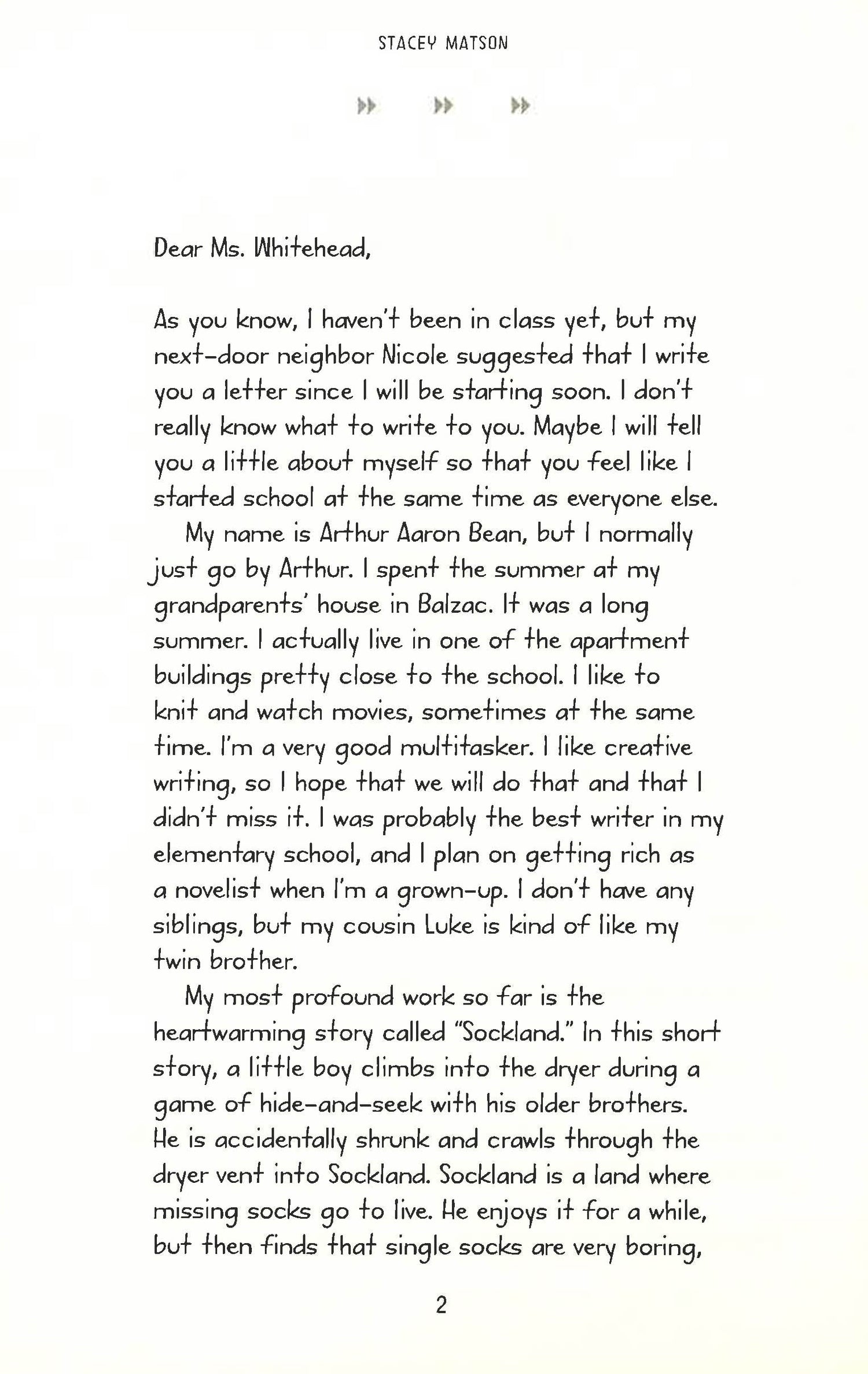 Arthur Bean is a genius-it's just that no one else realizes this quite yet. He's going to be a world-famous author, and the first step is to win this year's story-writing contest. What he writes is pretty funny, but it gets him into trouble too. Like with his English teacher. And the school newspaper advisor. And cool girl Kennedy. And Arthur's number one nemesis, Robbie Zack. But all great authors spark controversy, so Arthur's not too concerned. Through letters, email exchanges, "SEE ME" notes and doodles, enter the funny, touching, and often mixed-up mind of Arthur Bean, creative genius.