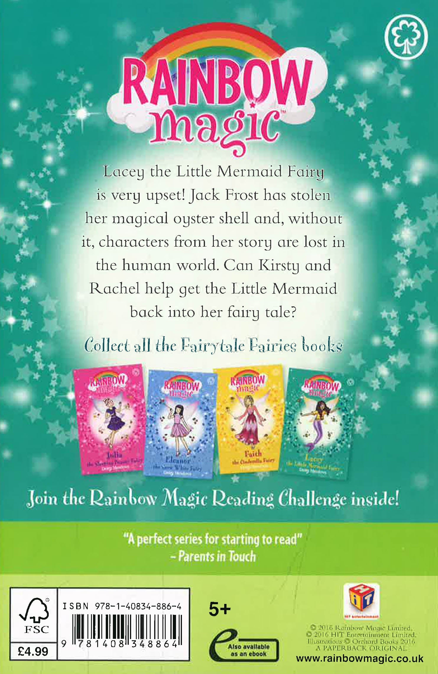 Read all four fairy adventures in the Fairytale Fairies set! Julia the Sleeping Beauty Fairy; Eleanor the Snow White Fairy; Faith the Cinderella Fairy; Lacey the Little Mermaid Fairy.