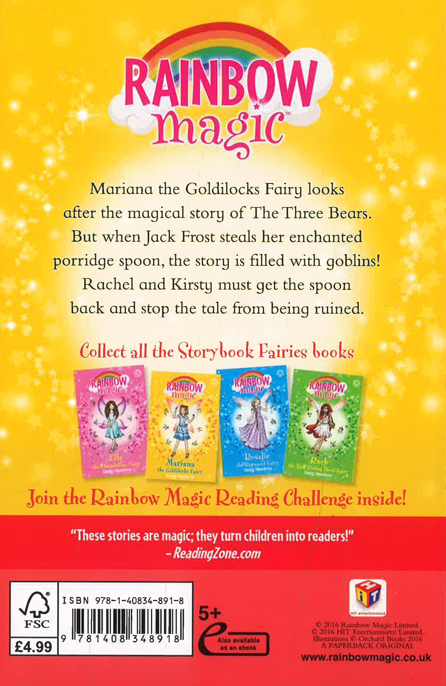 Mariana the Goldilocks Fairy looks after the magical story of the Three Bears. But when Jack Frost steals her enchanted porridge spoon, the bears are replaced with horrid goblins! Rachel and Kirsty must get the spoon back and save the story from being ruined.