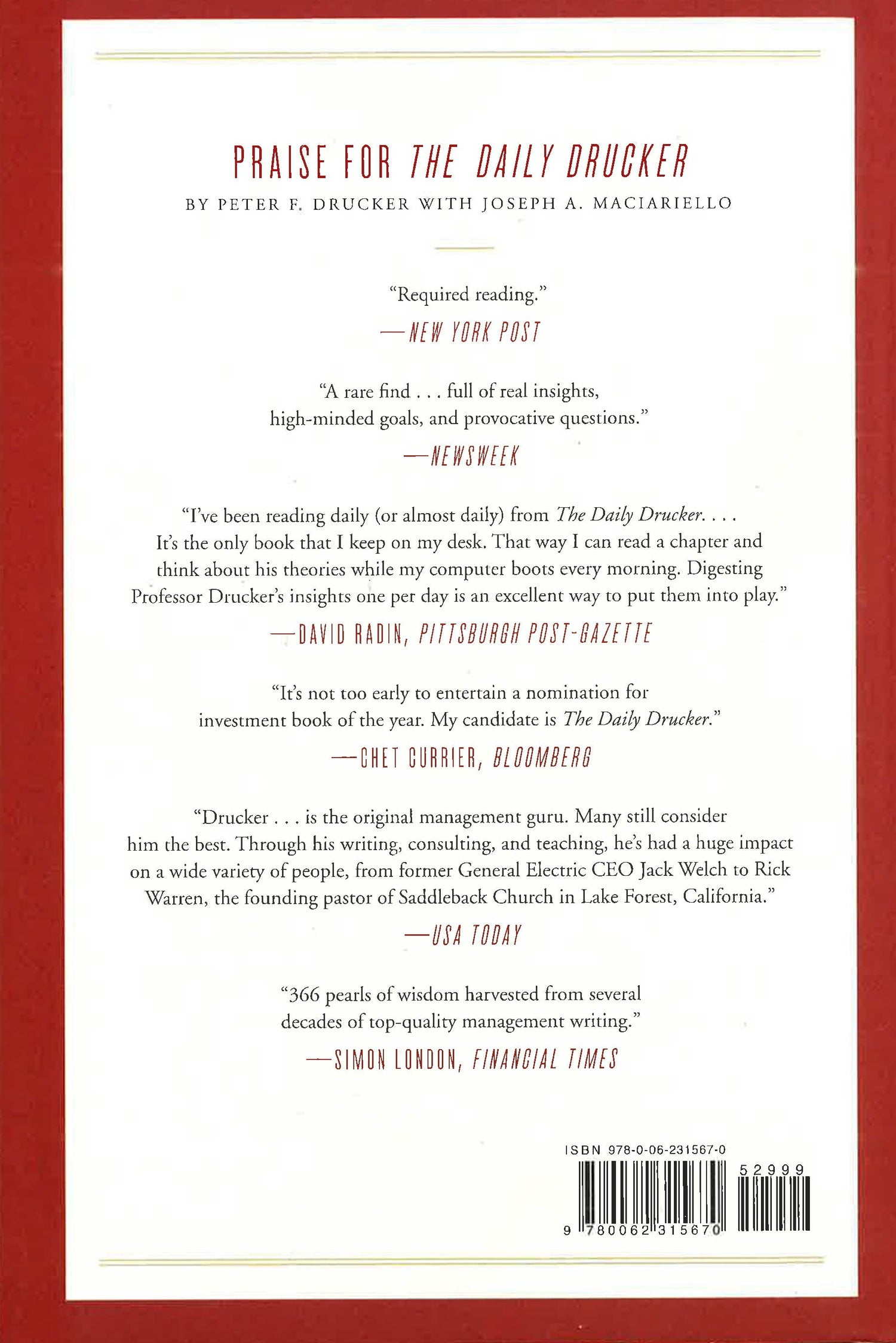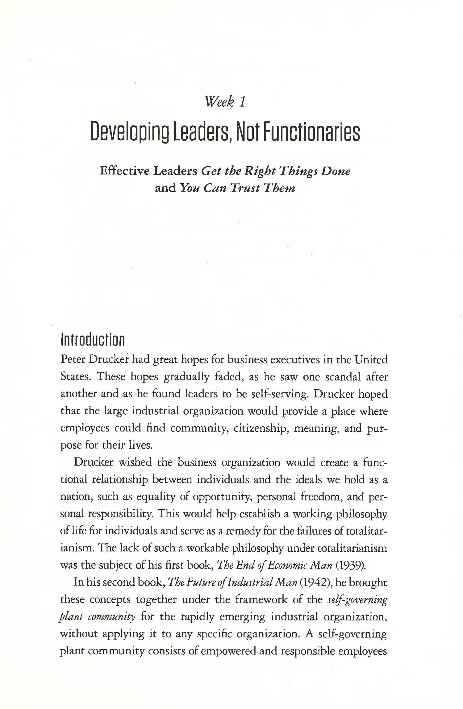 A year-long leadership development course, divided into short, weekly lessons, based on Peter Drucker's personal coaching program, previously unpublished material, and selected readings from the management guru's classic works, compiled by his longtime collaborator Joseph A. Maciariello. A Year with Peter Drucker distills the essence of Peter Drucker's personal mentorship program into an easy-to-follow 52-week course, exploring the themes Drucker felt were most important to leadership development, including: * Leaders Must Set Sights on the Important and not the Urgent-a key differentiator between a subordinate and a chief. * Management is a Human Activity-Process must serve people, in and out of the organization. * The Roadmap to Personal Effectiveness-the importance of mission and doing the Right Things not just Getting Things Done. * The critical importance of leadership succession especially at top ranks of the organization. Each weekly management meditation includes a lesson and a message or anecdote taken from Drucker's extensive body of work, as well as suggestions for further reading, reflective questions, and quick, easy prompts to help readers incorporate the knowledge they've learned into their daily work. A lifetime of wisdom brilliantly honed into a single essential volume by Drucker's collaborator Joseph A. Maciariello, A Year with Peter Drucker gives both lifelong Drucker fans and young executives now discovering his brilliance an invaluable opportunity to learn directly from the late master.