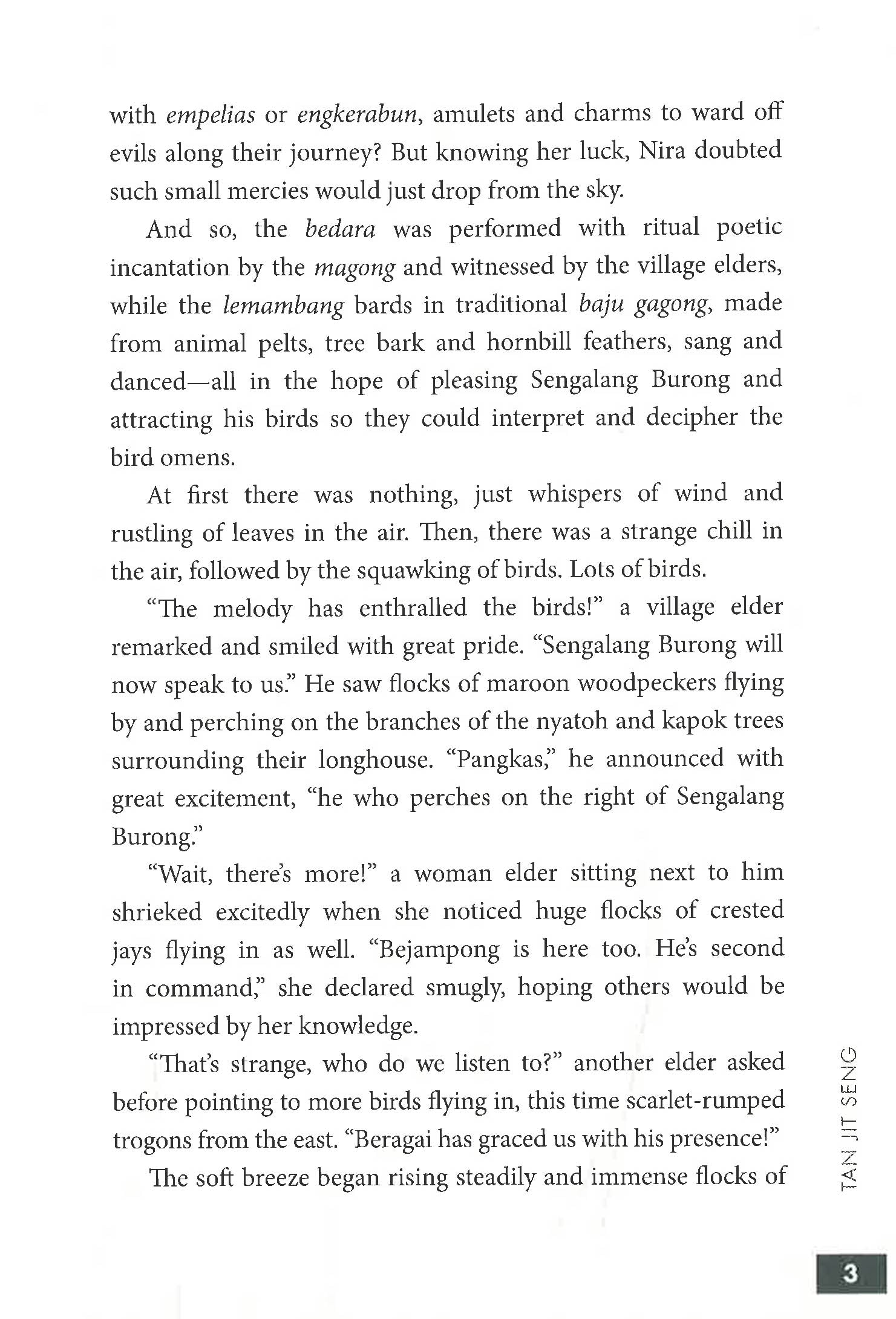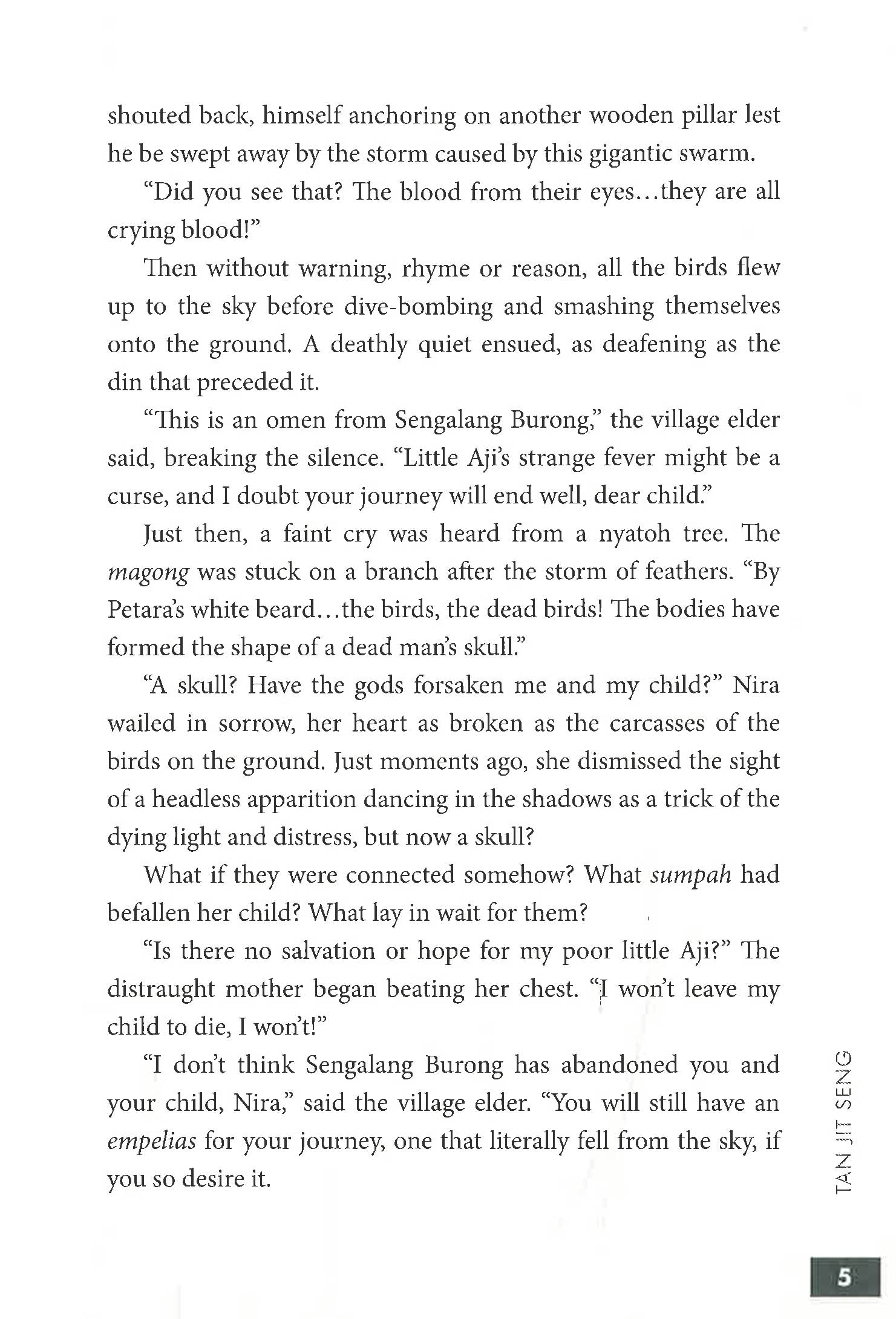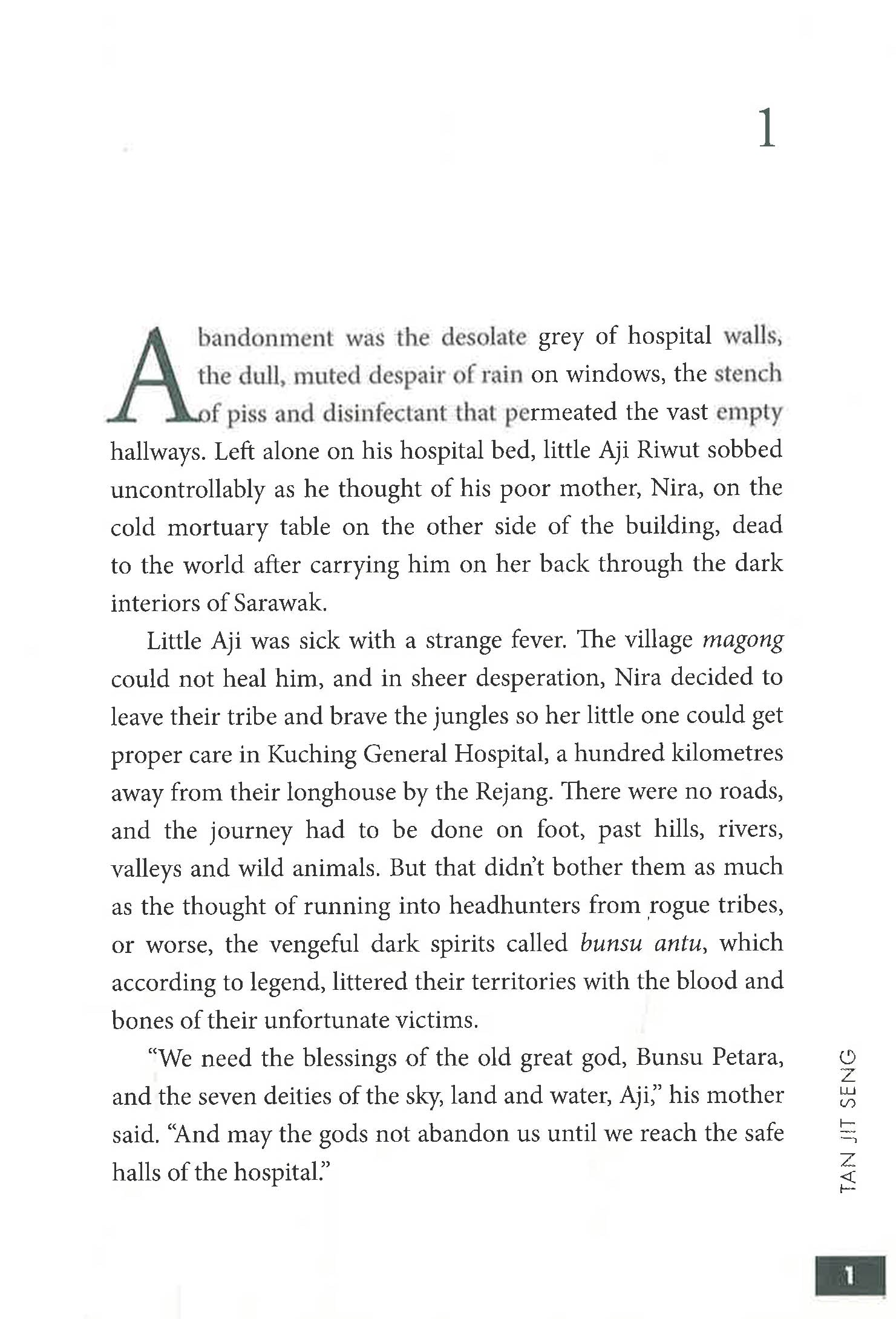 tells the story of Nira, a young woman trekking the dark interiors of Sarawak with a sick child on her back to get to Kuching General Hospital, a hundred kilometres away. On the way, she meets a whole host of demons, spirits, ghouls and ghosts, and gets a little help from above, in the form of magical feathers from the seven omen birds of legend. Nira and her son, Aji, get caught up in the middle of an epic war aeons in the making, between the