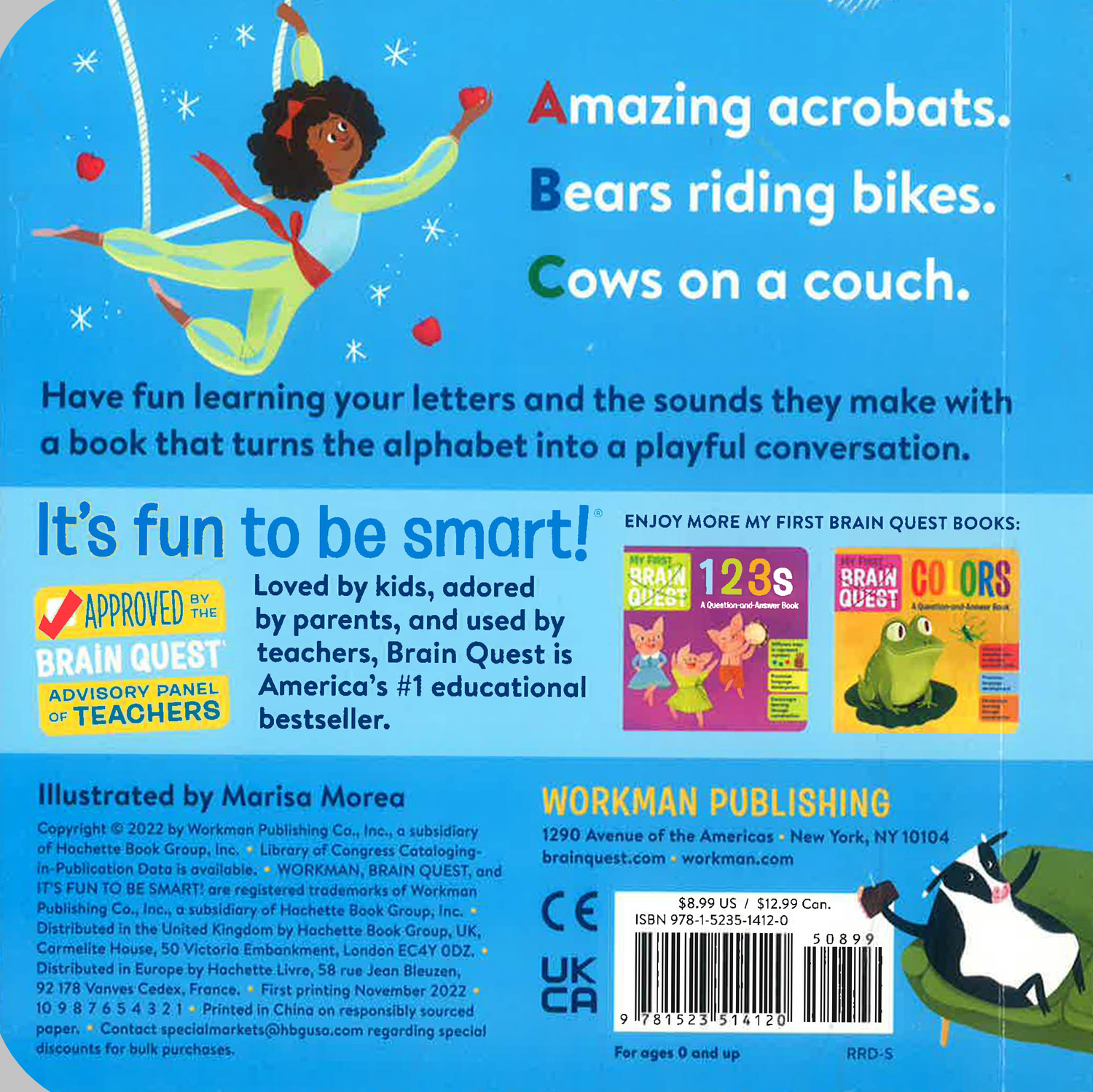 Introduce your child to the foundational skill of learning their ABC's with this fun and engaging guide to the alphabet. My First Brain Quest: ABCs is a delightful alphabet book that helps babies and toddlers learn the letters of the alphabet, expand their vocabulary, and develop phonics skills. Each letter of the alphabet is showcased with an engaging alliteration, a fun illustration, and questions that support conversation about counting, colors, comparison, and more. Smart, colorful, grounded in educational principles, and reviewed by a panel of early learning experts this board book introduces the alphabet in a bright, engaging way.