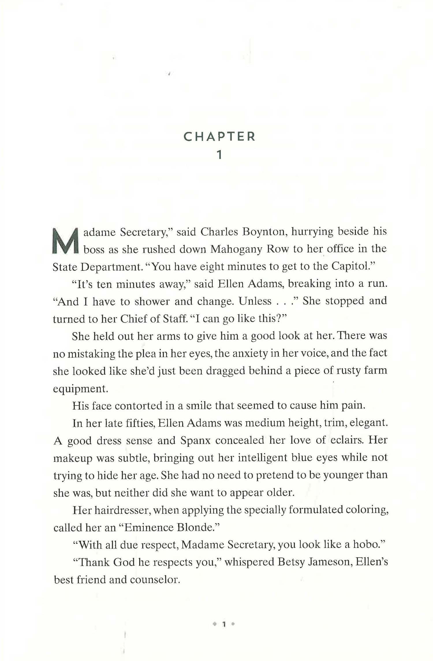 As the new president addresses Congress for the first time, with Secretary Adams in attendance, Anahita Dahir, a young foreign service officer (FSO) on the Pakistan desk at the State Department, receives a baffling text from an anonymous source.