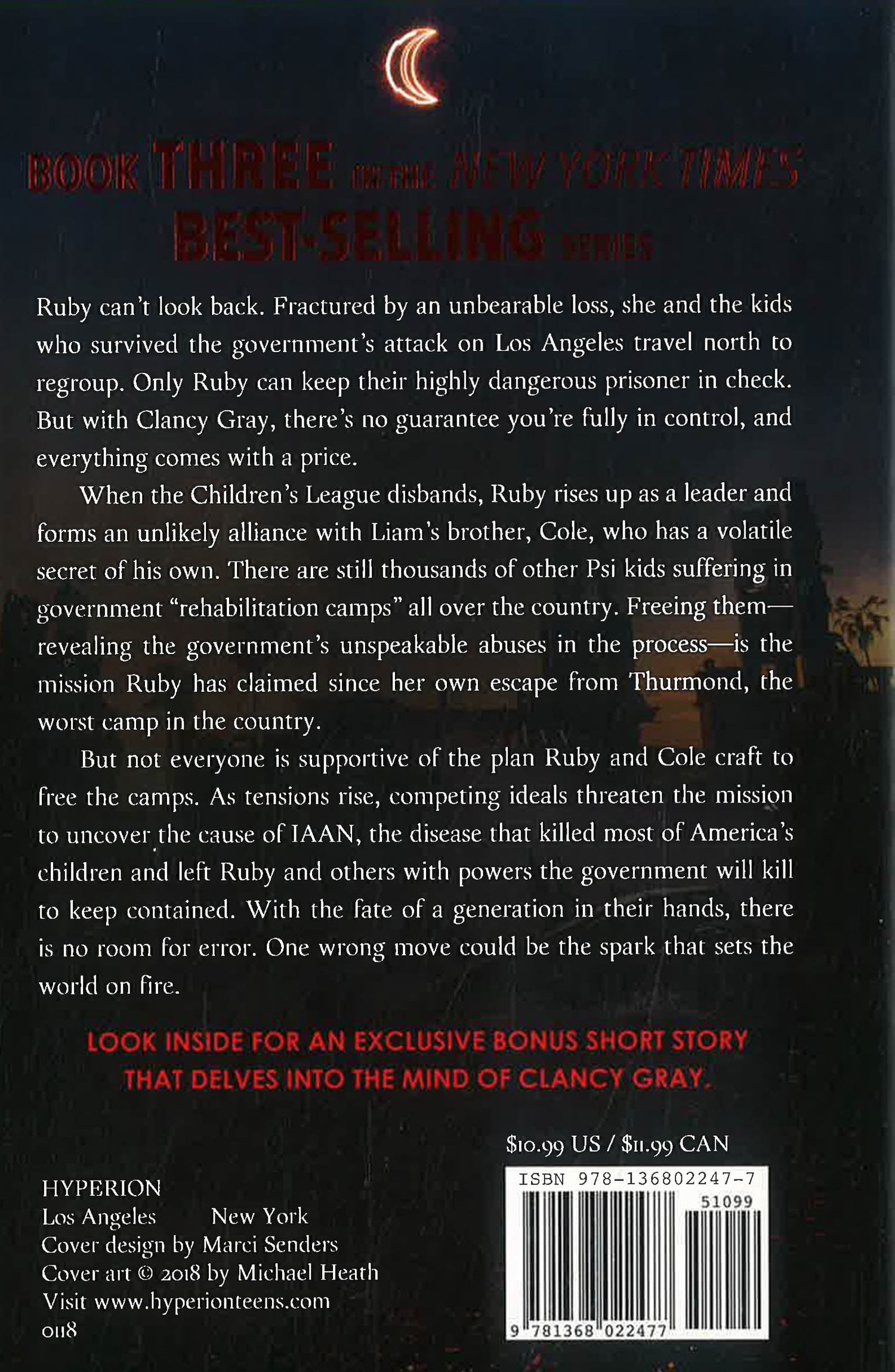When the Children's League disbands, Ruby rises up as a leader and forms an unlikely allegiance with Liam's brother, Cole, who has a volatile secret of his own. There are still thousands of other Psi kids suffering in government "rehabilitation camps" all over the country. Freeing them--revealing the government's unspeakable abuses in the process--is the mission Ruby has claimed since her own escape from Thurmond, the worst camp in the country.