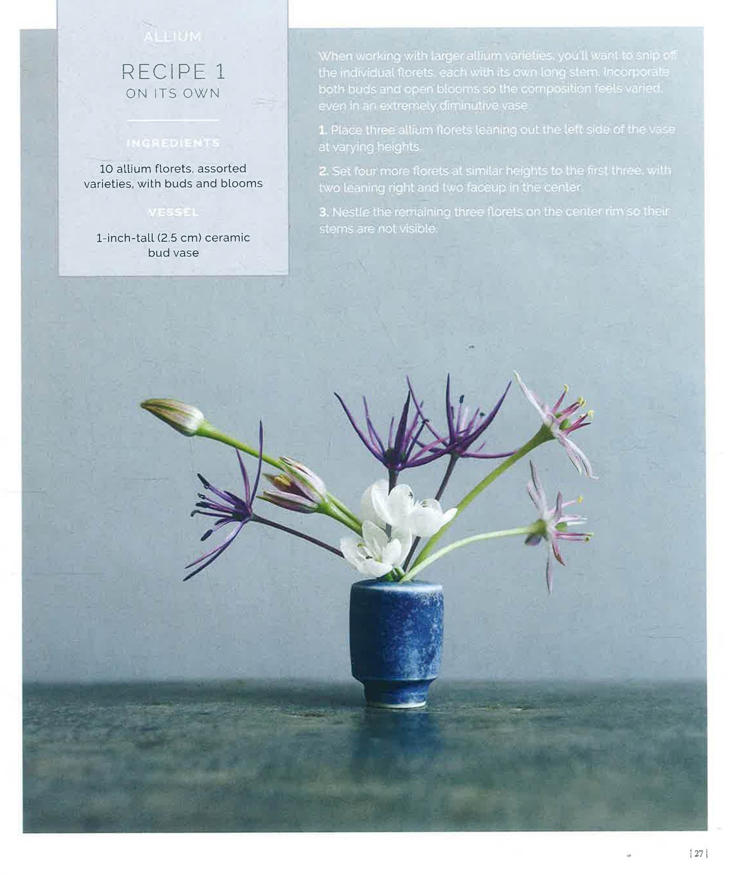 The featured flowers include varieties widely available at florists or farmers’ markets as well as tiny treasures found sprouting from sidewalks and walls, clipped from the landscape or garden, or pruned from common houseplants. The book also includes ideas for unexpected vessels (dollhouse suppliers are a great source for miniature vases!), a flower care primer, and all the design techniques readers need to know.