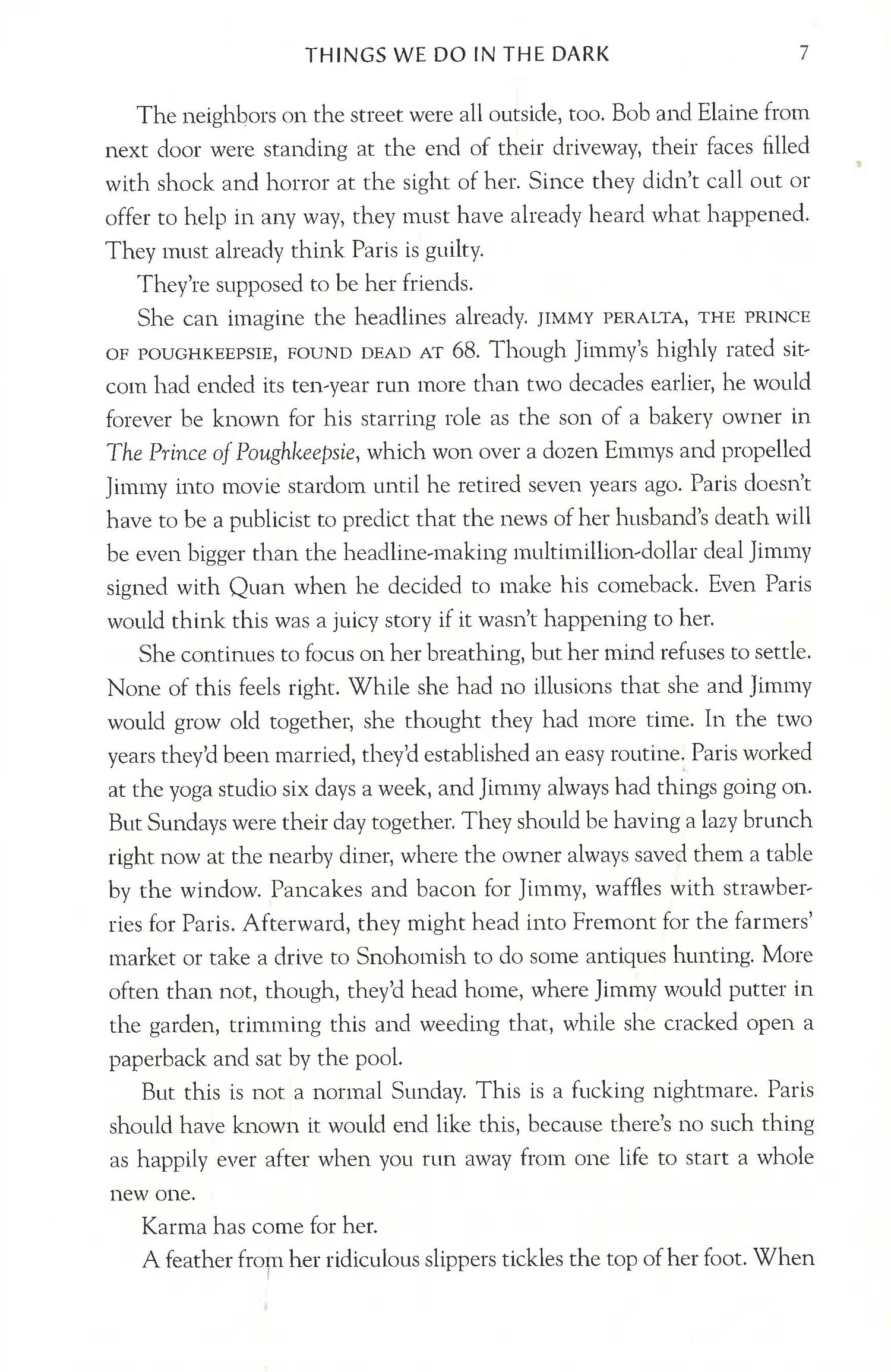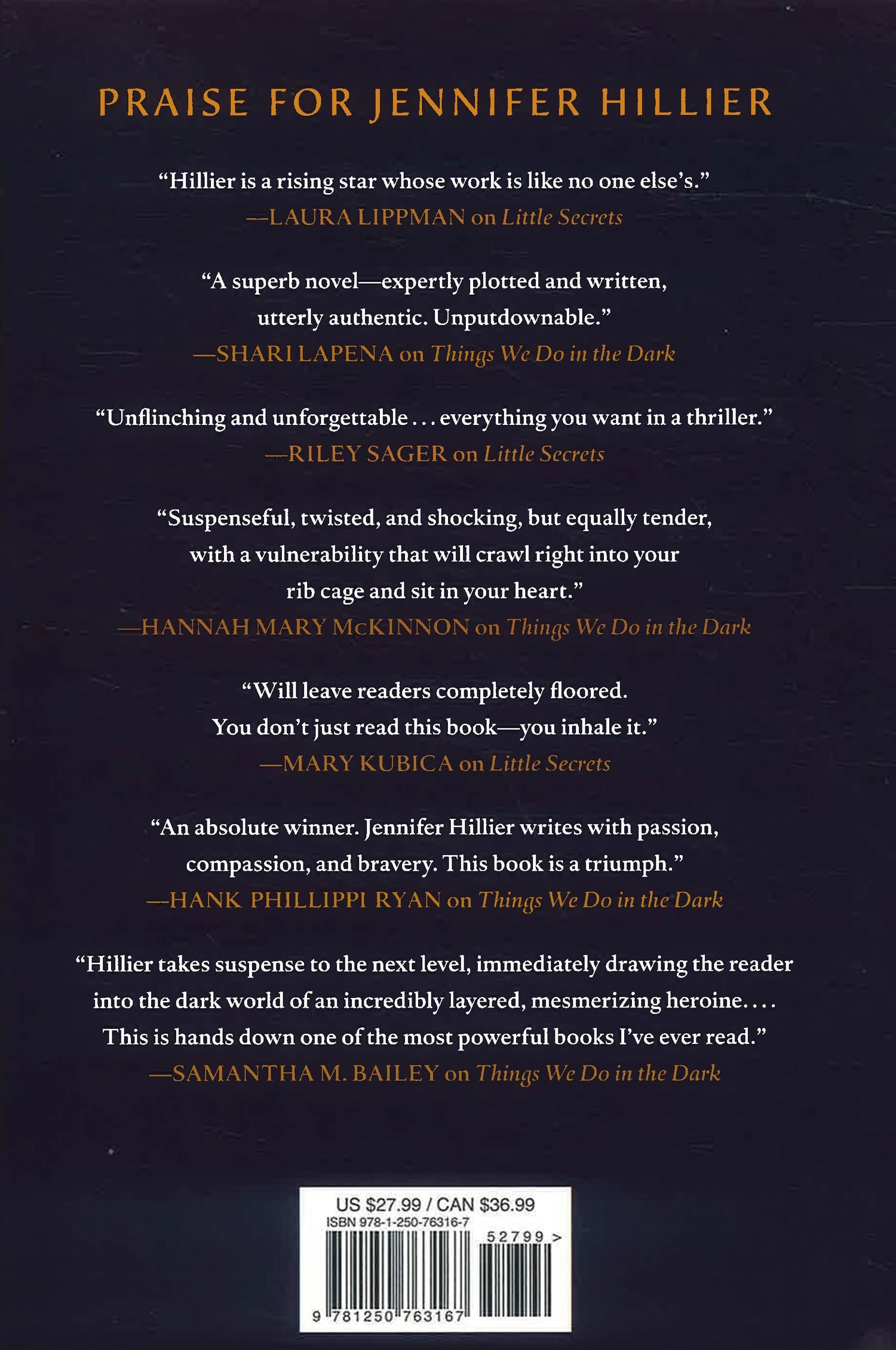 Things We Do in the Dark is a brilliant new thriller from Jennifer Hillier, the award-winning author of the breakout novels Little Secrets and Jar of Hearts. Paris Peralta is suspected of killing her celebrity husband, and her long-hidden past now threatens to destroy her future.