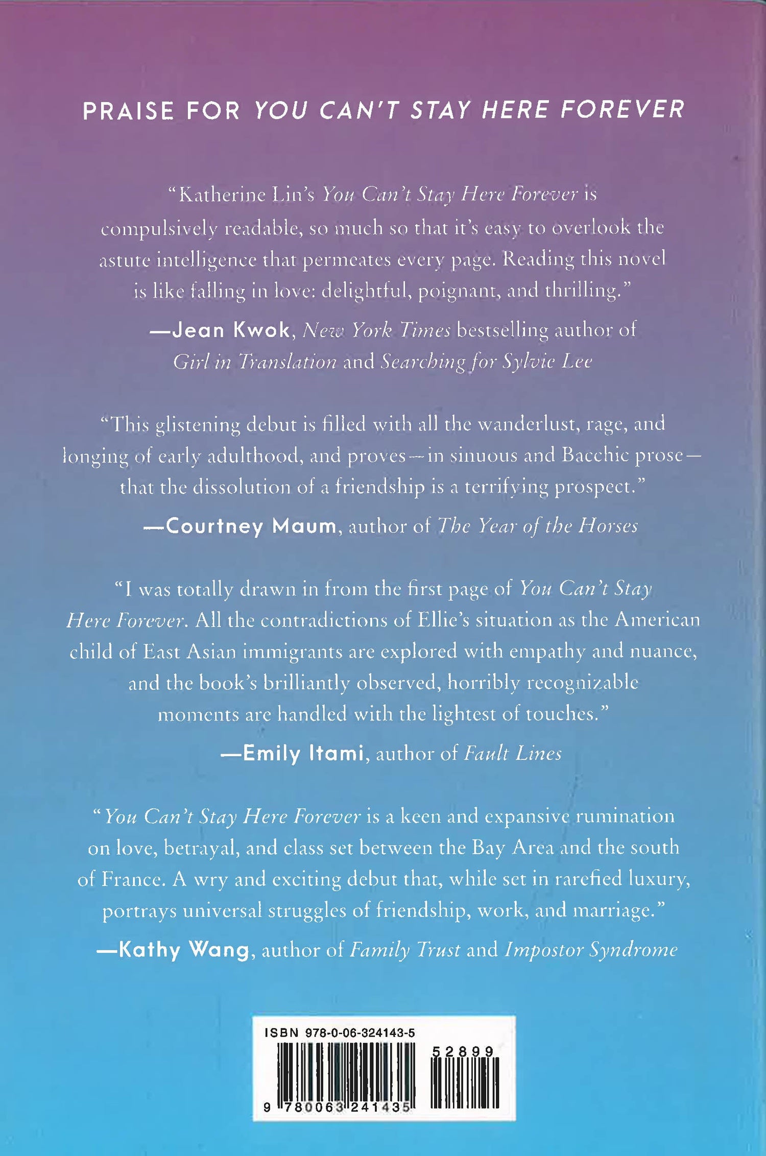 Taking the reader from San Francisco to the gilded luxury of the south of France, You Can't Stay Here Forever is a sharply funny and exciting debut that explores the slippery nature of marriage, the push and pull between friends, and the interplay of race and privilege, seen through the eyes of a young Asian American woman.