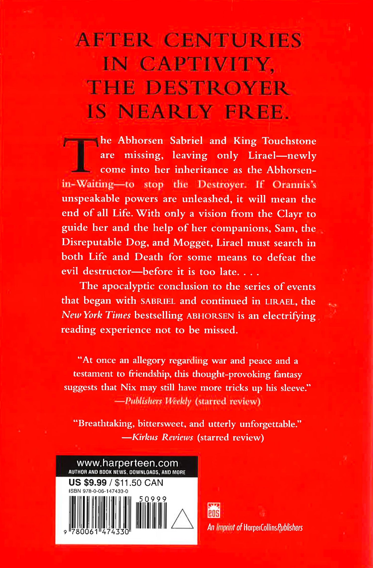 The Abhorsen Sabriel and King Touchstone are missing, leaving only Lirael—newly come into her inheritance as the Abhorsen-in-Waiting—to stop the Destroyer. If Orannis's unspeakable powers are unleashed, it will mean the end of all Life. With only a vision from the Clayr to guide her, and the help of her companions, Sam, the Disreputable Dog, and Mogget, Lirael must search in both Life and Death for some means to defeat the evil destructor—before it is too late. . . .