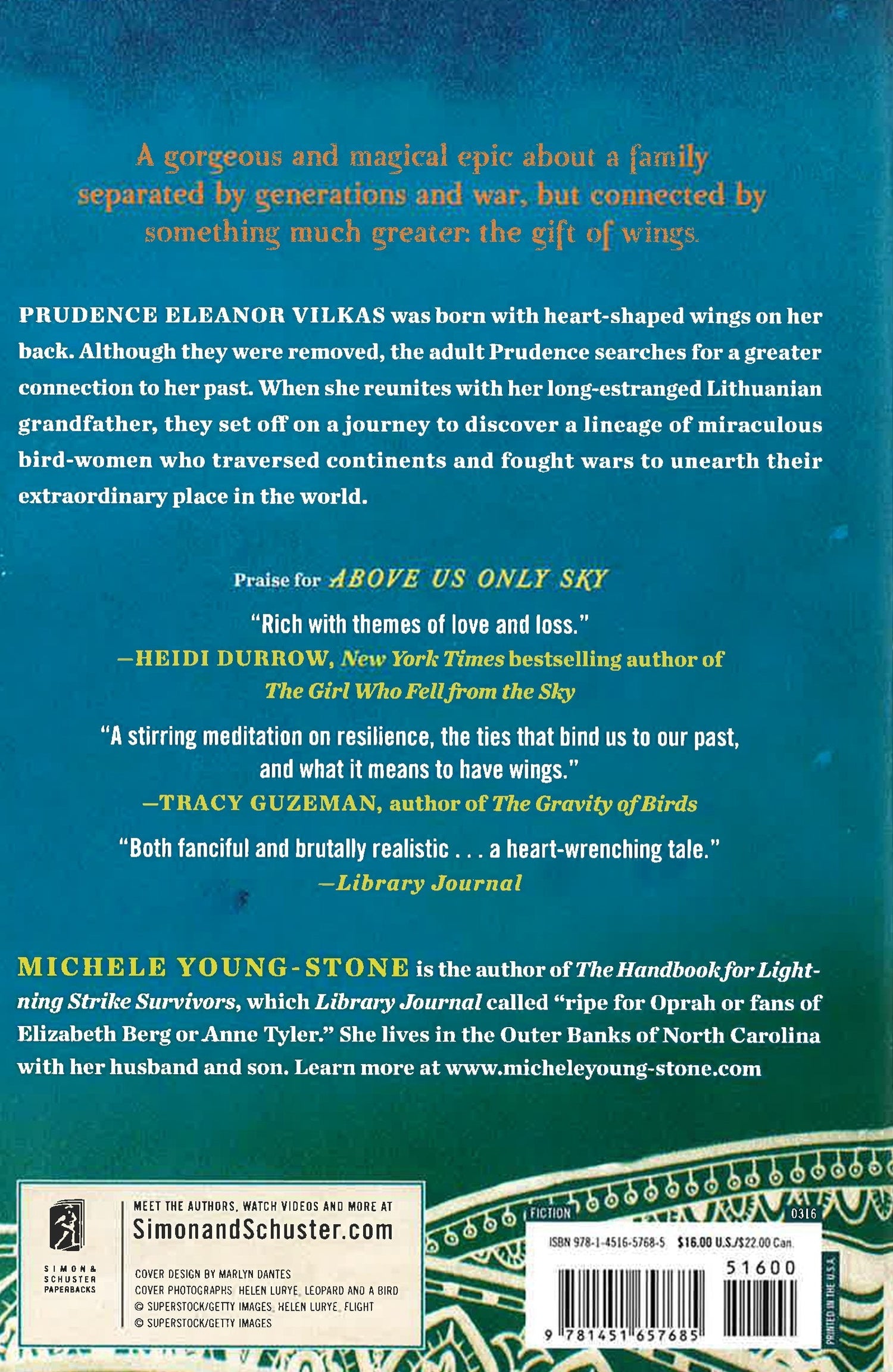 A "gripping, heartwarming" (Bookpage) novel about a family separated by oceans, generations, and war, but connected by something much greater--the gift of wings. On March 29, 1973, Prudence Eleanor Vilkas was born with heart-shaped wings pressed accordion-style against her back. Considered a birth defect, her wings were surgically removed, leaving only the ghost of them behind. In 1980, Prudence's mother takes her from Nashville to Florida, to a town inhabited by people who have run as far as they can without fins or wings. In this new town, Prudence is befriended by a boy who can see what others can't, including Prudence's ghostly wings. The unexpected and unimaginable bubble up from the depths of the Atlantic to confront Prudence when she meets her long-estranged Lithuanian grandfather and discovers a miraculous lineage beating and pulsing with past Lithuanian bird-women, storytellers with wings dragging the dirt, survivors perched on radio towers, lovers lit up like fireworks and heroes disguised as everyday men and women. Above Us Only Sky spans the 1863 January Uprising against Russian Tsarist rule in Eastern Europe to the fall of the Berlin Wall and Lithuania's independence in 1991. It is a "daring, imaginative" (Milepost magazine) story of mutual understanding between the old and young; it is a love story, a story of survival, and most importantly, a story about disovering where we belong in the world. Young-Stone seamlessly balances Lithuanian history with magical realism in this "amazing, spellbinding, incredible journey" (Literary Hoarders). *This book may have a remainder mark