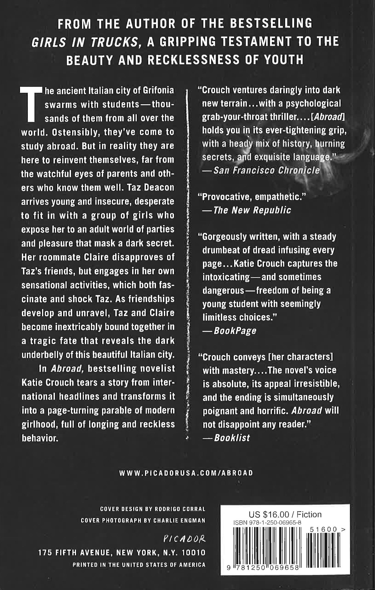 From the author of the bestselling Girls in Trucks, a gripping testament to the beauty and recklessness of youth. The ancient Italian city of Grifonia swarms with students-thousands of them from all over the world. Ostensibly, they've come to study abroad. But in reality they are here to reinvent themselves, far from the watchful eyes of parents and others who know them well. Taz Deacon arrives young and insecure, desperate to fit in with a group of girls who expose her to an adult world of parties and pleasure that mask a dark secret. Her roommate Claire disapproves of Taz's friends, but engages in her own sensational activities, which both fascinate and shock Taz. As friendships develop and unravel, Taz and Claire become inextricably bound together in a tragic fate that reveals the dark underbelly of this beautiful Italian city. In Abroad, bestselling novelist Katie Crouch tears a story from international headlines and transforms it into a page-turning parable of modern girlhood, full of longing and reckless behavior.