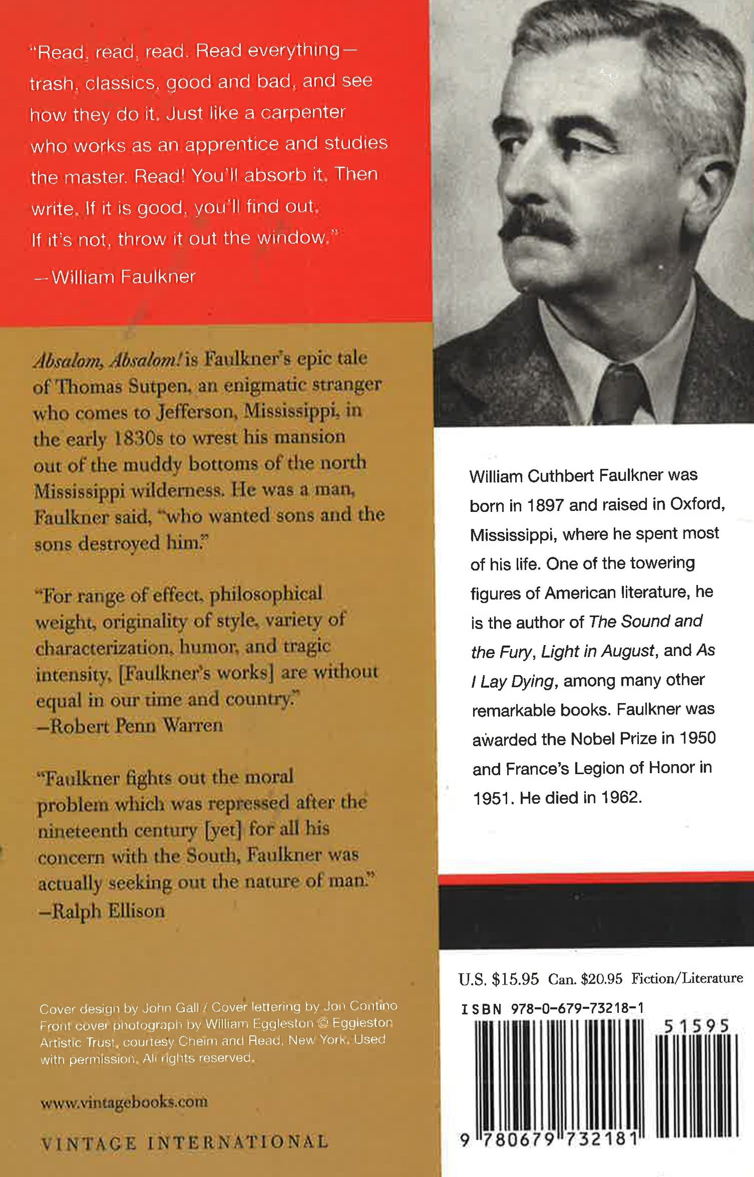 "Read, read, read. Read everything--trash, classics, good and bad, and see how they do it. Just like a carpenter who works as an apprentice and studies the master. Read! You'll absorb it. Then write. If it is good, you'll find out. If it's not, throw it out the window." --William Faulkner Absalom, Absalom! is Faulkner's epic tale of Thomas Sutpen, an enigmatic stranger who comes to Jefferson, Mississippi, in the early 1830s to wrest his mansion out of the muddy bottoms of the north Mississippi wilderness. He was a man, Faulkner said, "who wanted sons and the sons destroyed him."