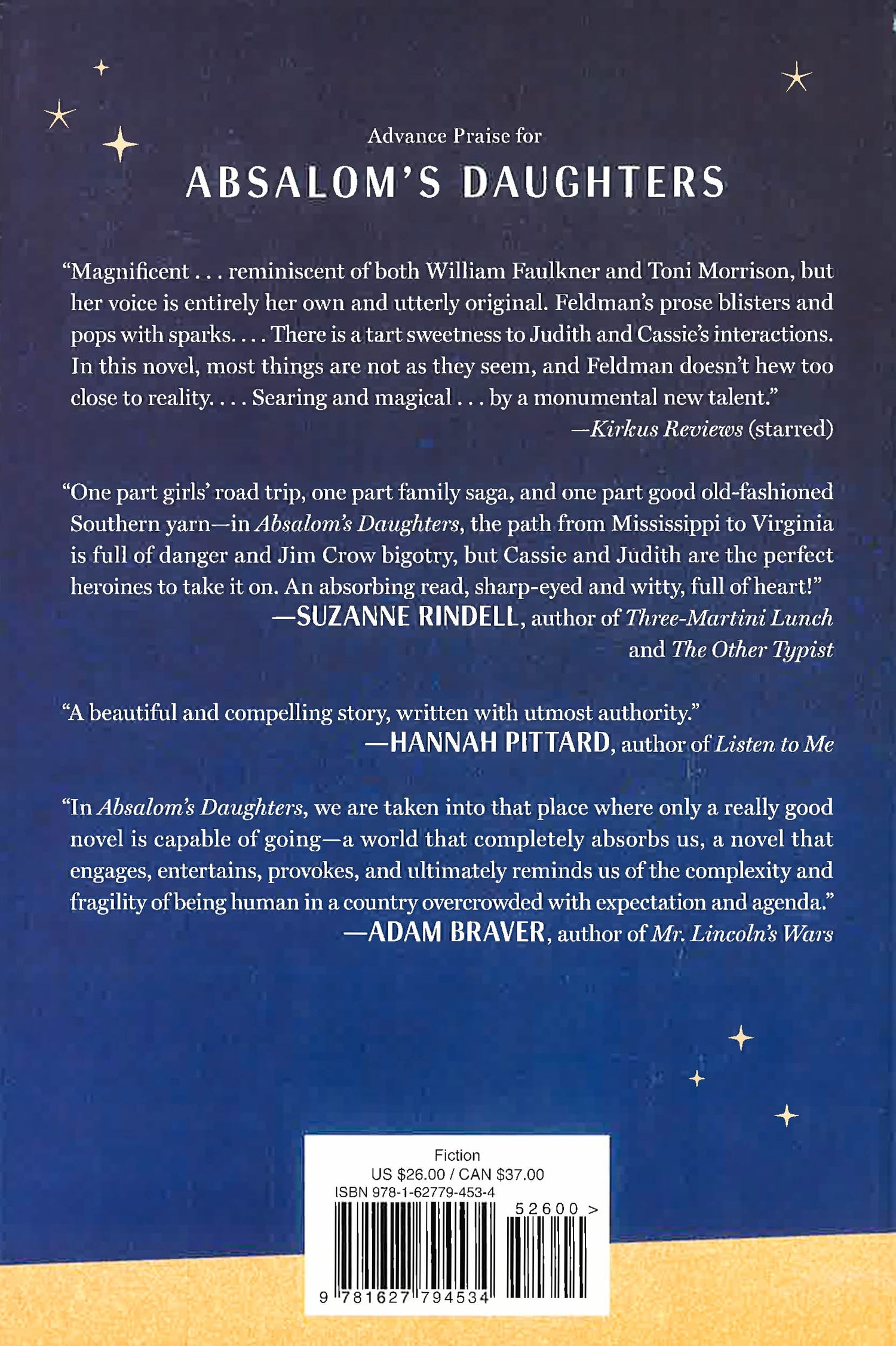 In an old junk car, with a frying pan, a ham, and a few dollars hidden in a shoe, they set off through the American Deep South of the 1950s, a bewitchingly beautiful landscape as well as one bedeviled by racial strife and violence. Suzanne Feldman's Absalom’s Daughters combines the buddy movie, the coming-of-age tale, and a dash of magical realism to enthrall and move us with an unforgettable, illuminating novel.