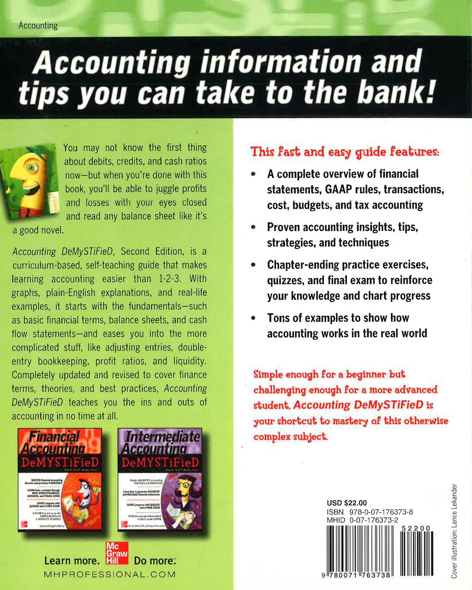 Accounting information and tips you can take to the bank! You may not know the first thing about debits, credits, and cash ratios now-but when you're done with this book, you'll be able to juggle profits and losses with your eyes closed and read any balance sheet like it's a good novel. Accounting DeMySTiFieD, Second Edition, is a curriculum-based, self-teaching guide that makes learning accounting easier than 1-2-3. With graphs, plain-English explanations, and real-life examples, it starts with the fundamentals-such as basic financial terms, balance sheets, and cash flow statements-and eases you into the more complicated stuff, like adjusting entries, double entry bookkeeping, profit ratios, and liquidity. Completely updated and revised to cover finance terms, theories, and best practices, Accounting DeMySTiFieD teaches you the ins and outs of accounting in no time at all. This fast and easy guide features: A complete overview of financial statements, GAAP rules, transactions, cost, budgets, and tax accountingProven accounting insights, tips, strategies, and techniquesChapter-ending practice exercises, quizzes, and final exam to reinforce your knowledge and chart progressTons of examples to show how accounting works in the real world Simple enough for a beginner but challenging enough for a more advanced student, Accounting DeMySTiFieD is your shortcut to mastery of this otherwise complex subject.