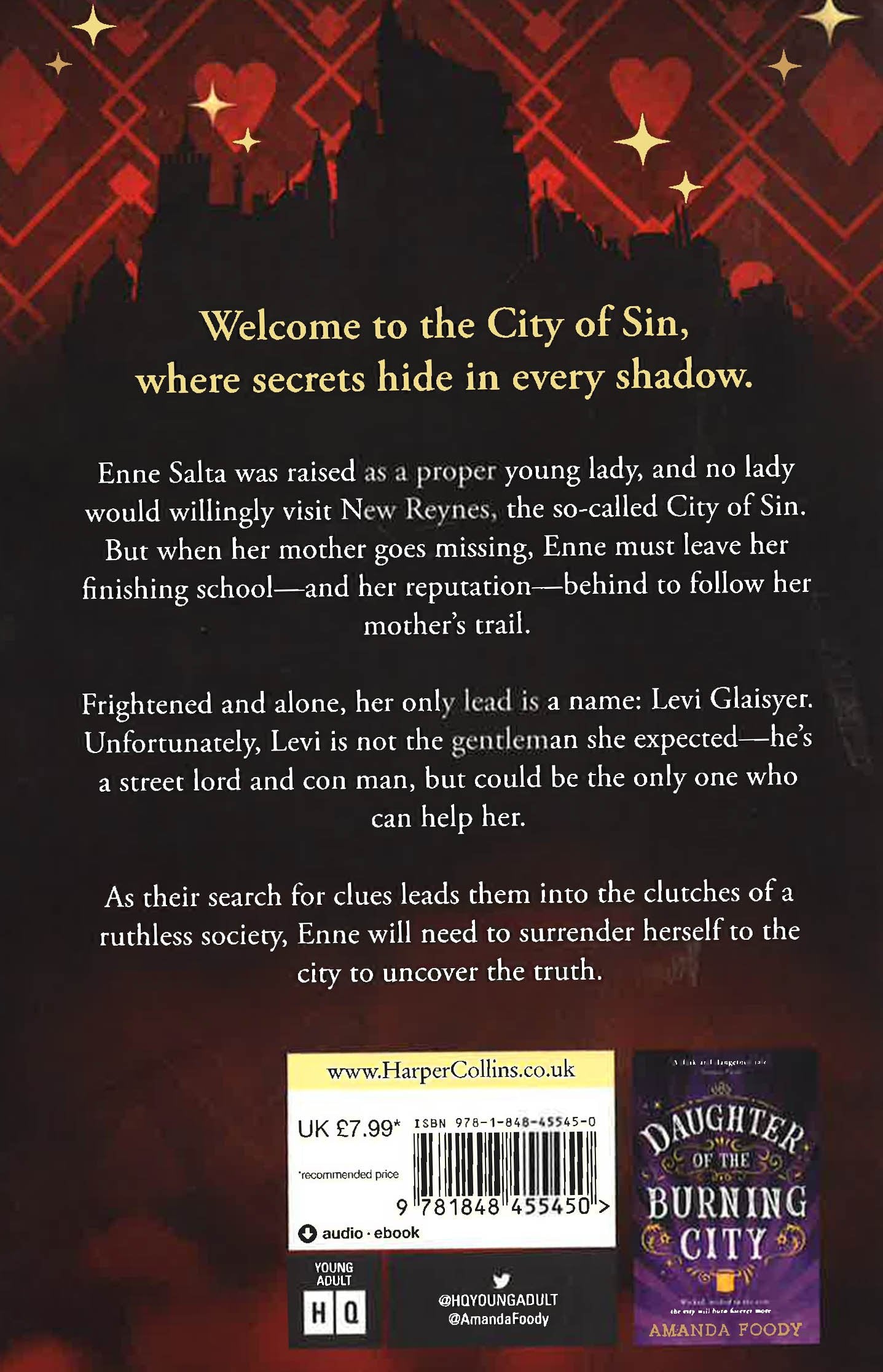 From the author of Daughter of the Burning City comes a thrilling new series about the scandalous lives in the City of Sin. 'Amanda Foody has a wicked imagination.' Stephanie Garber, Sunday Times bestselling author of Caraval Take a card. The price is your soul. Welcome to the City of Sin, where casino families reign, gangs infest the streets...and secrets hide in every shadow Enne Salta was raised as a proper young lady, and no lady would willingly visit New Reynes, the so-called City of Sin. But when her mother goes missing, Enne must leave her finishing school, and her reputation, behind to follow her mother's trail. Frightened and alone, her only lead is a name: Levi Glaisyer. Unfortunately, Levi is not the gentleman she expected, he's a street lord and con man, but he might just be the only person who can help her. As their search for clues leads them through glamorous casinos, cabarets and into the clutches of a ruthless society, Enne will need to surrender herself to the city to uncover the truth. And she'll need to play the game.