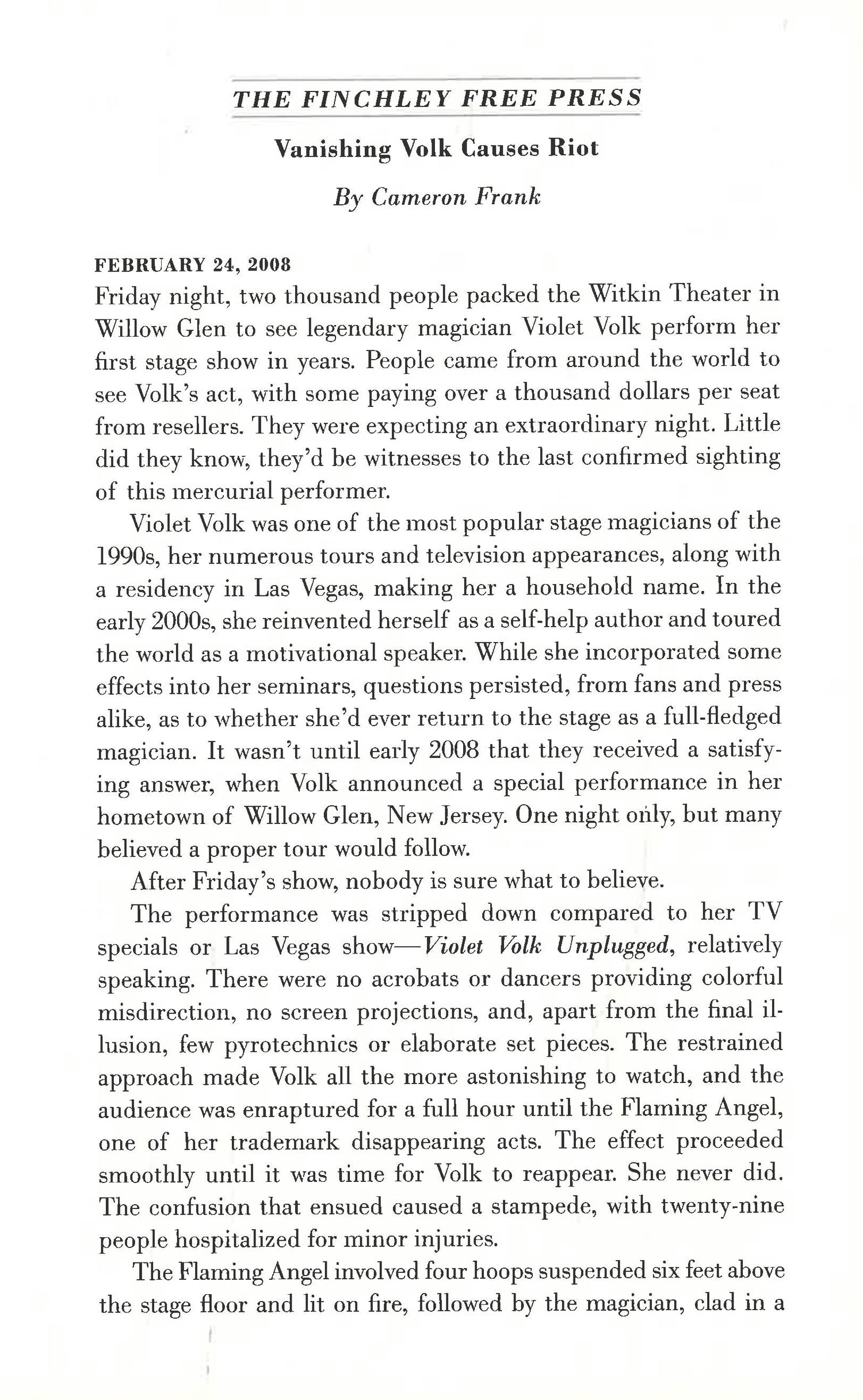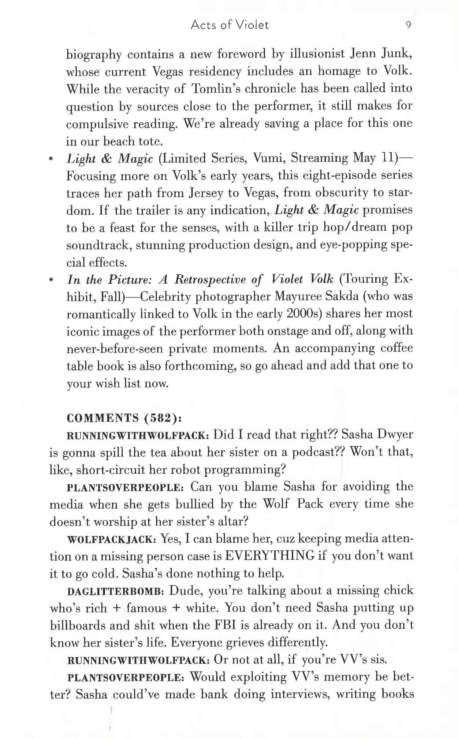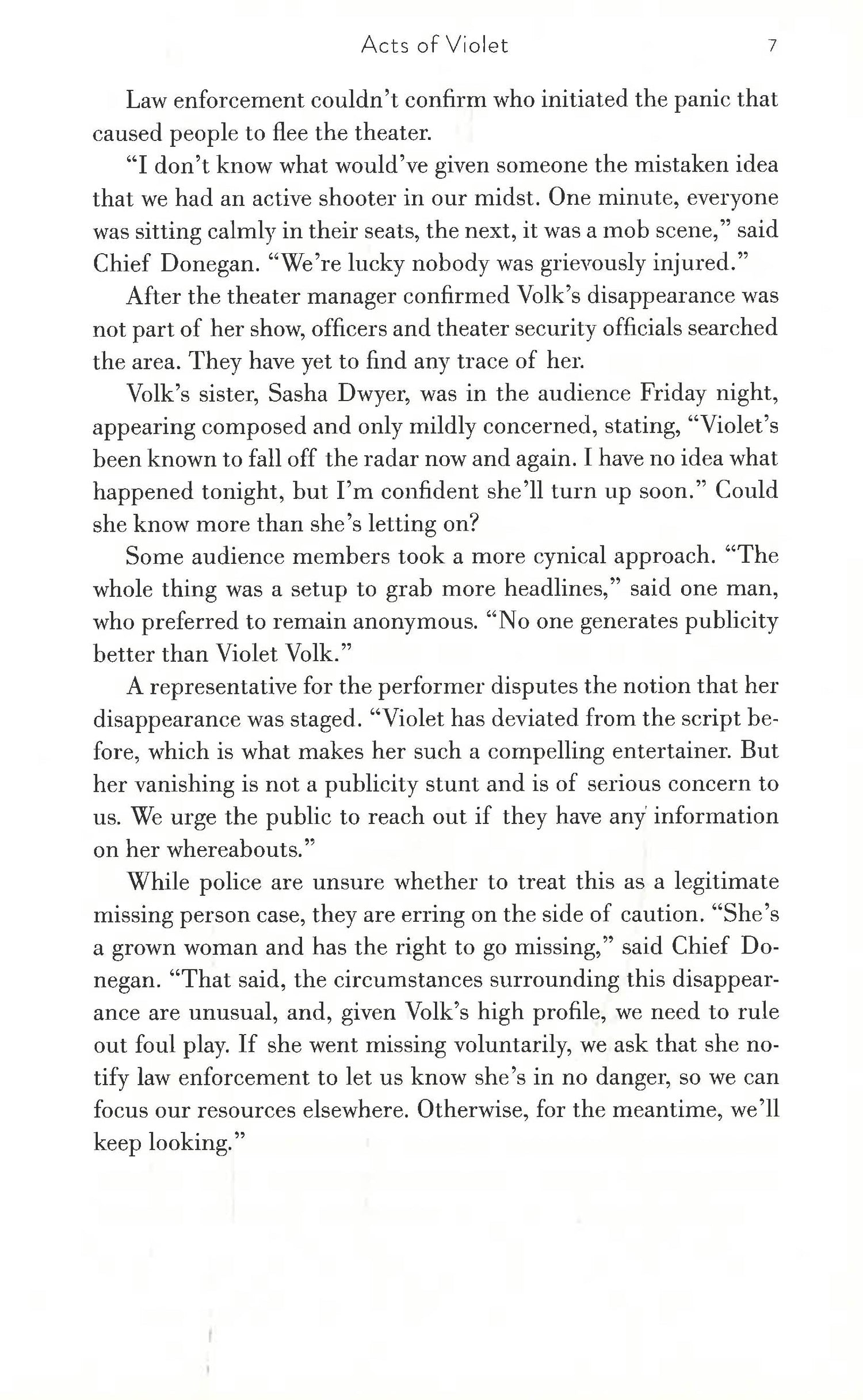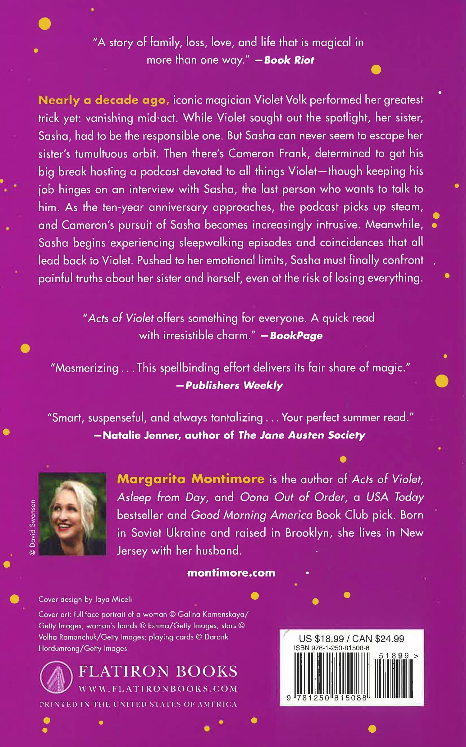 Nearly a decade ago, iconic magician Violet Volk performed her greatest trick yet: vanishing mid-act. Though she hasn’t been seen since, her hold on the public hasn’t wavered. While Violet sought out the spotlight, her sister Sasha, ever the responsible one, took over their mother’s salon and built a quiet life for her daughter, Quinn. But Sasha can never seem to escape her sister’s orbit or her memories of their unresolved, tumultuous relationship. Then there’s Cameron Frank, determined to finally get his big break hosting a podcast devoted to all things Violet―though keeping his job hinges on an exclusive interview with Sasha, the last person who wants to talk to him. As the ten-year anniversary approaches, the podcast picks up steam, and Cameron’s pursuit of Sasha becomes increasingly intrusive. He isn’t the only one wondering what secrets she might be keeping: Quinn, loyal to the aunt she always idolized, is doing her own investigating. Meanwhile, Sasha begins to experience an unsettling series of sleepwalking episodes and coincidences, which all lead back to Violet. Pushed to her emotional limits, Sasha must finally confront the most painful truths about her sister, and herself, even at the risk of losing everything. Alternating between Sasha’s narration and Cameron’s podcast transcripts, interspersed with documents that offer a tantalizing peek at Violet herself, Acts of Violet is an utterly original, propulsive story of fame, deception, and forgiveness that will make you believe in magic.