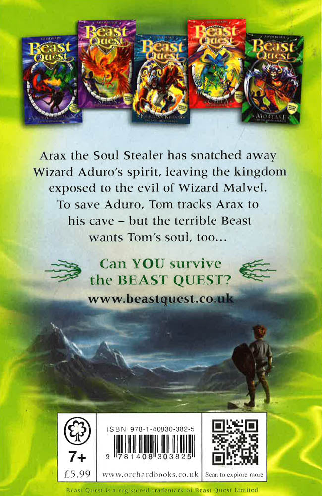Battle Beasts and fight Evil with Tom and Elenna in the bestselling adventure series for boys and girls aged 7 and up! Battle Beasts and fight Evil with Tom and Elenna in the bestselling adventure series for boys and girls aged 7 and up!Arax the Soul Stealer has snatched away good Wizard Aduro's spirit, leaving the kingdom exposed to the evil of Wizard Malvel. To save Aduro, Tom tracks Arax to his cave - but the terrible Beast wants Tom's soul, too...If you like Beast Quest, check out Adam Blade's other series: Team Hero, Sea Quest and Beast Quest: New Blood!