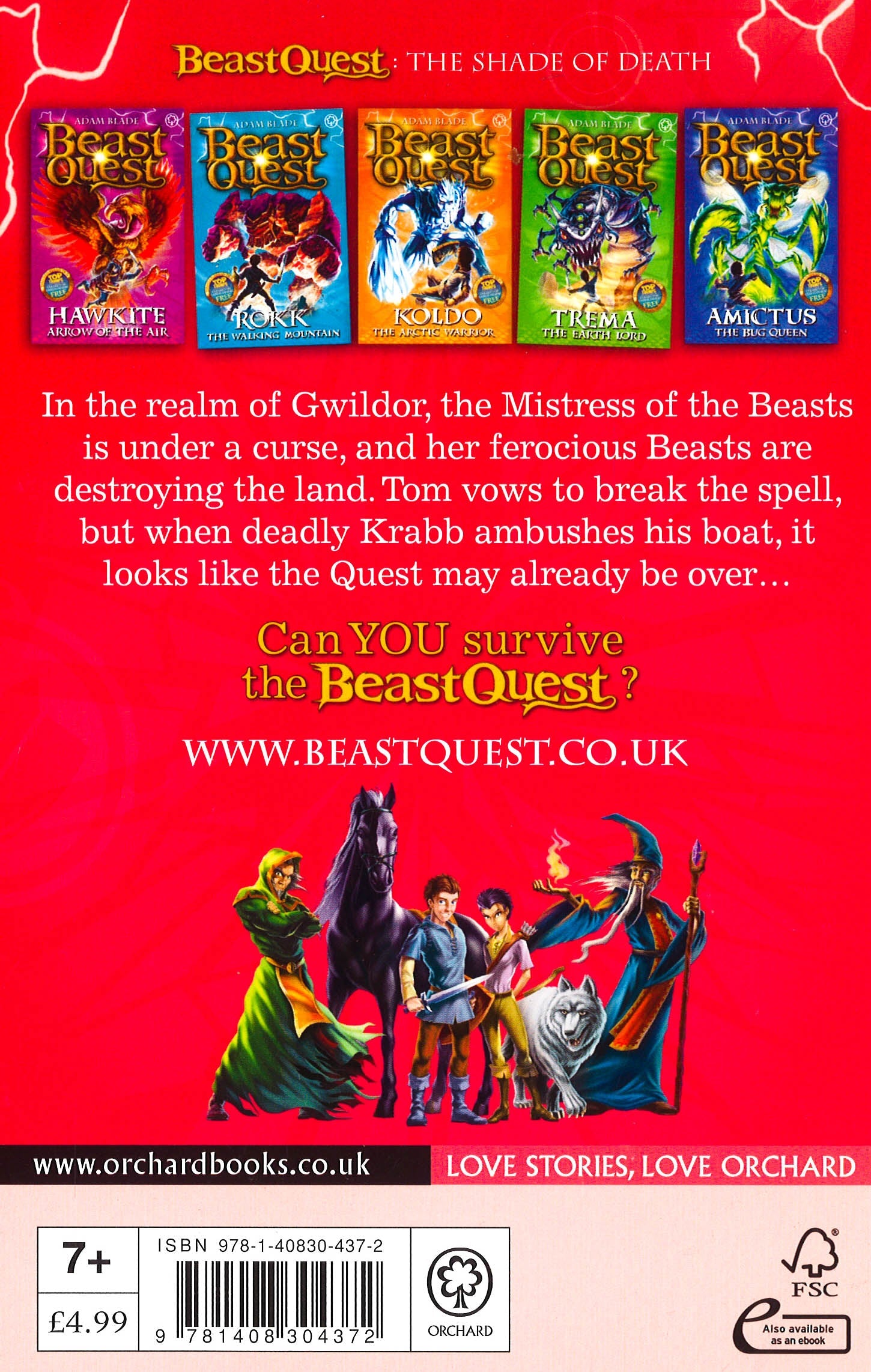 Battle fearsome beasts and fight evil with Tom and Elenna in the bestselling adventure series for boys and girls aged 7 and up. In the realm of Gwildor, the Mistress of the Beasts is under a curse, and her ferocious Beasts are destroying the land. Tom vows to break the spell, but when deadly Krabb ambushes his boat, it looks like the Quest may already be over...There are SIX thrilling adventures to collect in the Beast Quest: The Shade of Death series: Krabb Master of the Sea; Hawkite Arrow of the Air; Rokk the Walking Mountain; Koldo the Arctic Warrior; Trema the Earth Lord; Amictus the Bug Queen.If you like Beast Quest, check out Adam Blade's other series: Team Hero, Sea Quest and Beast Quest: New Blood!