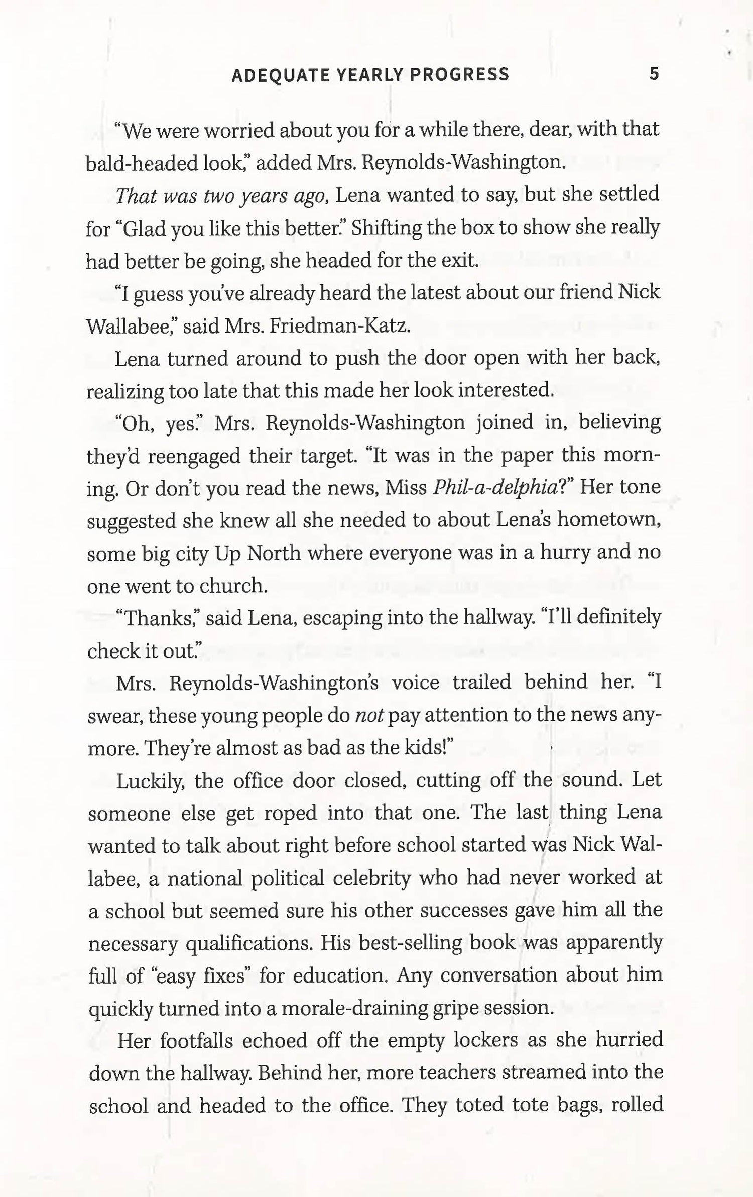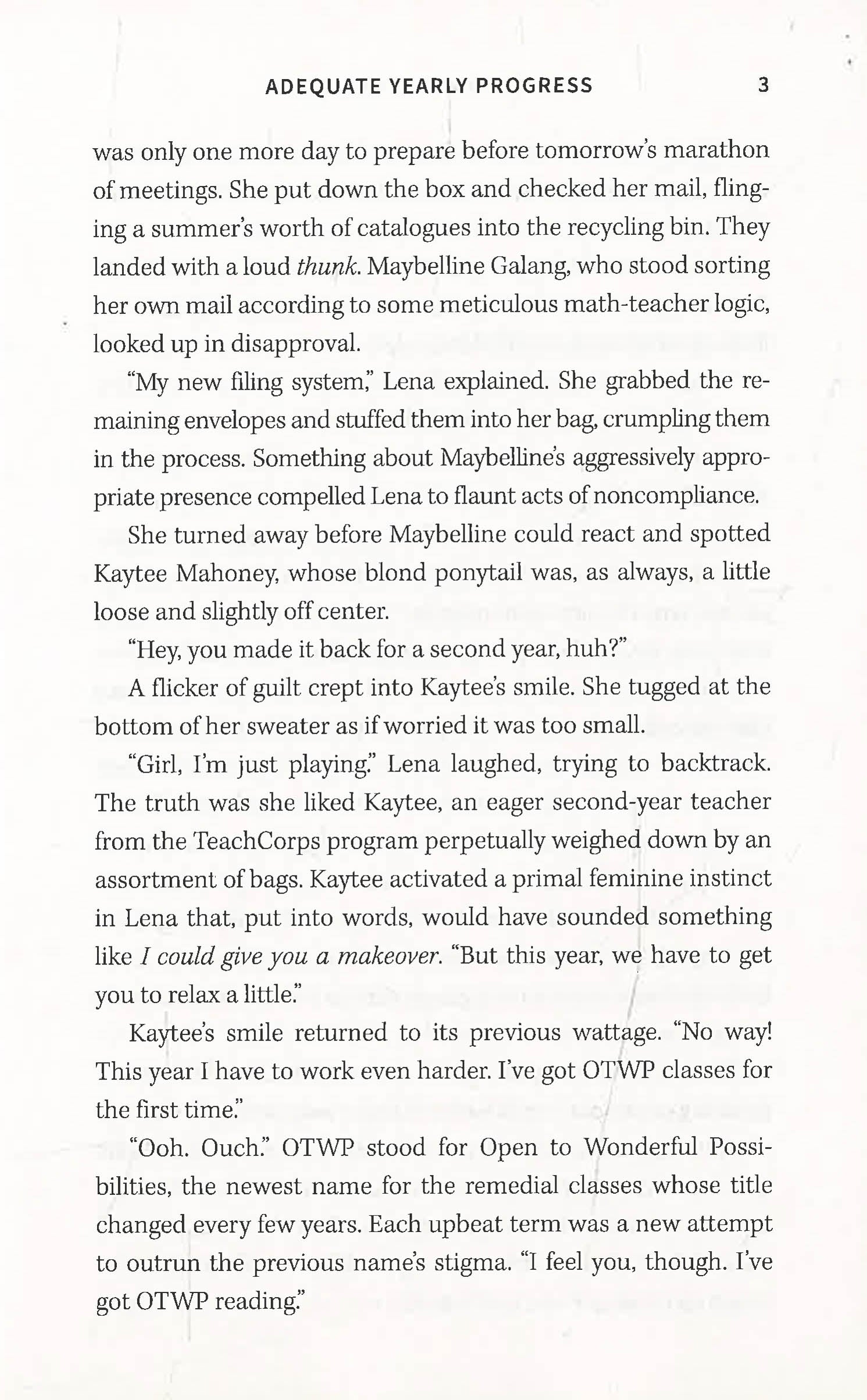 English teacher Lena Wright, a spoken-word poet, can never seem to truly connect with her students. Hernan D. Hernandez is confident in front of his biology classes, but tongue-tied around the woman he most wants to impress. Down the hall, math teacher Maybelline Galang focuses on the numbers as she struggles to parent her daughter, while Coach Ray hustles his troubled football team toward another winning season. Recording it all is idealistic second-year history teacher Kaytee Mahoney, whose anonymous blog gains new readers by the day as it drifts ever further from her in-class reality. And this year, a new superintendent is determined to leave his own mark on the school--even if that means shutting the whole place down.