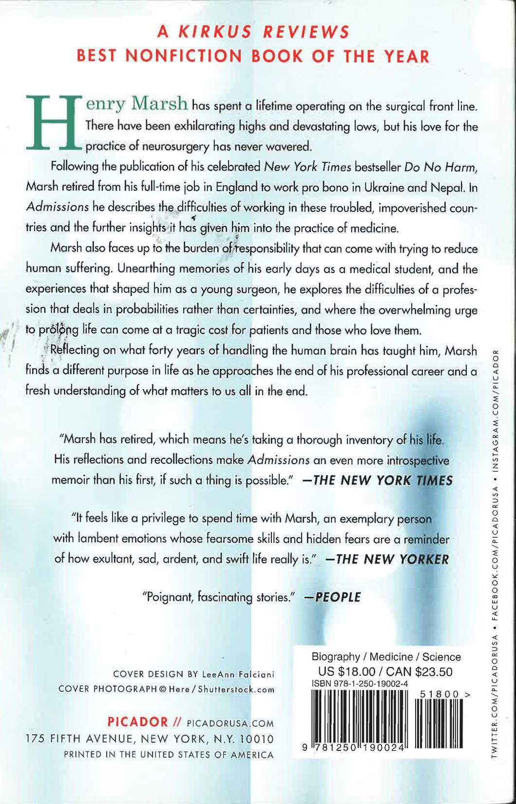 Henry Marsh has spent a lifetime operating on the surgical frontline. There have been exhilarating highs and devastating lows, but his love for the practice of neurosurgery has never wavered. Following the publication of his celebrated New York Times bestseller Do No Harm, Marsh retired from his full-time job in England to work pro bono in Ukraine and Nepal. In Admissions he describes the difficulties of working in these troubled, impoverished countries and the further insights it has given him into the practice of medicine. Marsh also faces up to the burden of responsibility that can come with trying to reduce human suffering. Unearthing memories of his early days as a medical student, and the experiences that shaped him as a young surgeon, he explores the difficulties of a profession that deals in probabilities rather than certainties, and where the overwhelming urge to prolong life can come at a tragic cost for patients and those who love them. Reflecting on what forty years of handling the human brain has taught him, Marsh finds a different purpose in life as he approaches the end of his professional career and a fresh understanding of what matters to us all in the end.