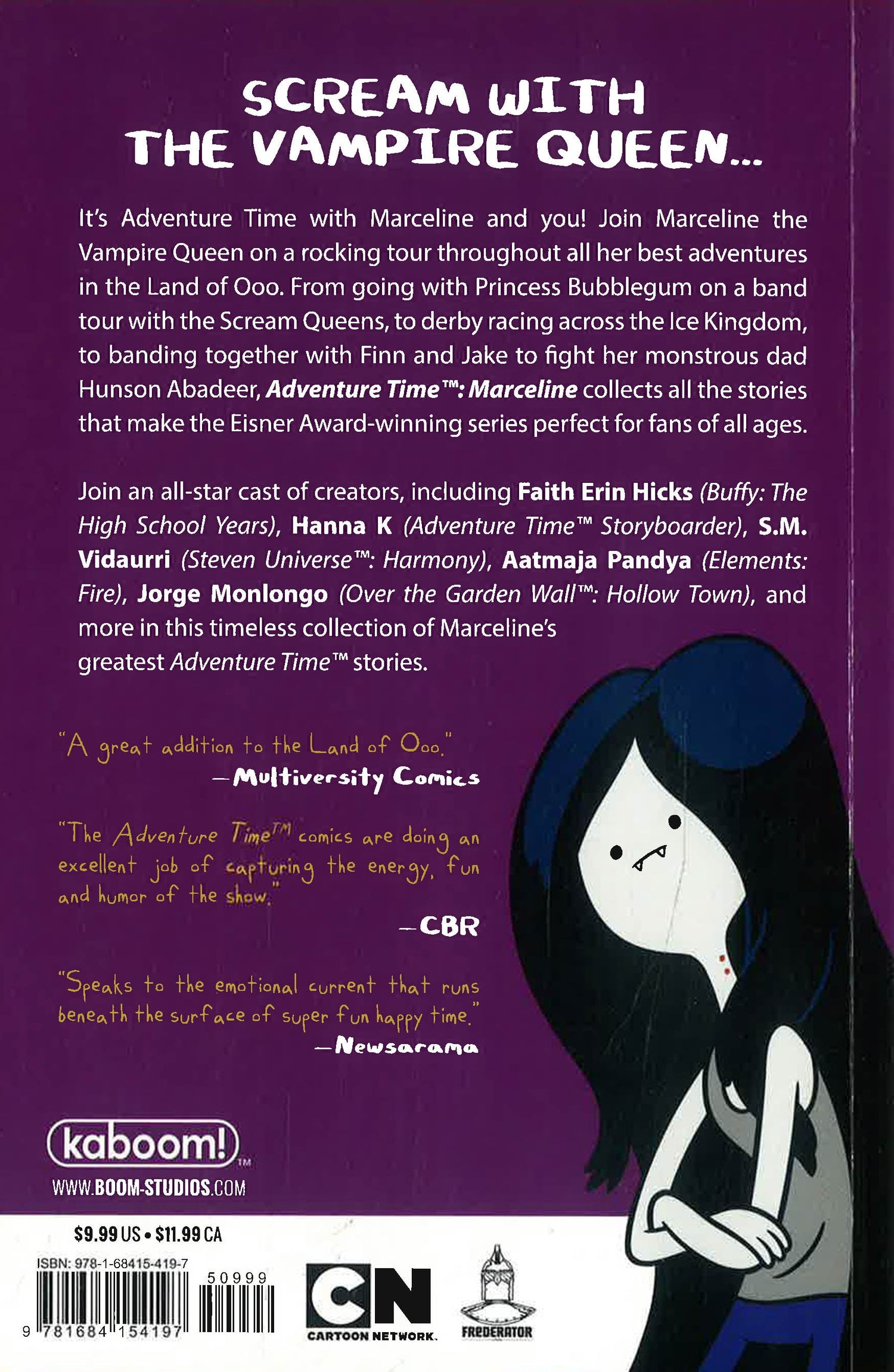 It’s Adventure Time with Marceline and you! Join Marceline the Vampire Queen on a rocking tour throughout all her best adventures in the Land of Ooo. From going with Princess Bubblegum on a band tour with the Scream Queens, to derby racing across the Ice Kingdom, to banding together with Finn and Jake to fight her monstrous dad Hunson Abadeer, Adventure Time™: Marceline collects all the stories that make the Eisner Award-winning series perfect for fans of all ages.
