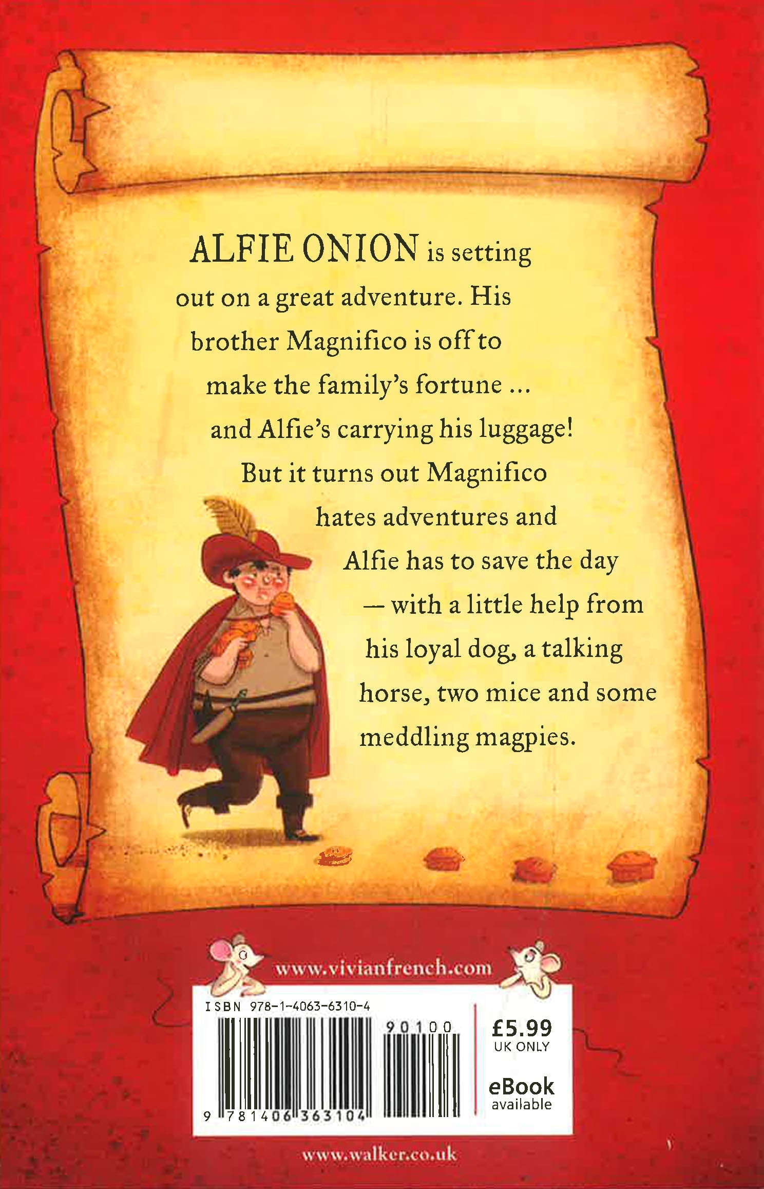 A stand-alone comic adventure for younger readers by sublime storyteller Vivian French, with pictures by a talented new illustrator and animator, Marta Kissi. Alfie Onion has just set off on a great adventure … but only to carry his brother’s luggage. It’s his elder brother, Magnifico Onion, who’s destined to win their family a Happily Ever After. But when it turns out Magnifico isn’t half the hero he’s cracked up to be, it falls to Alfie to save the day – with a little help from his loyal dog, a talking horse and a couple of meddling magpies.
