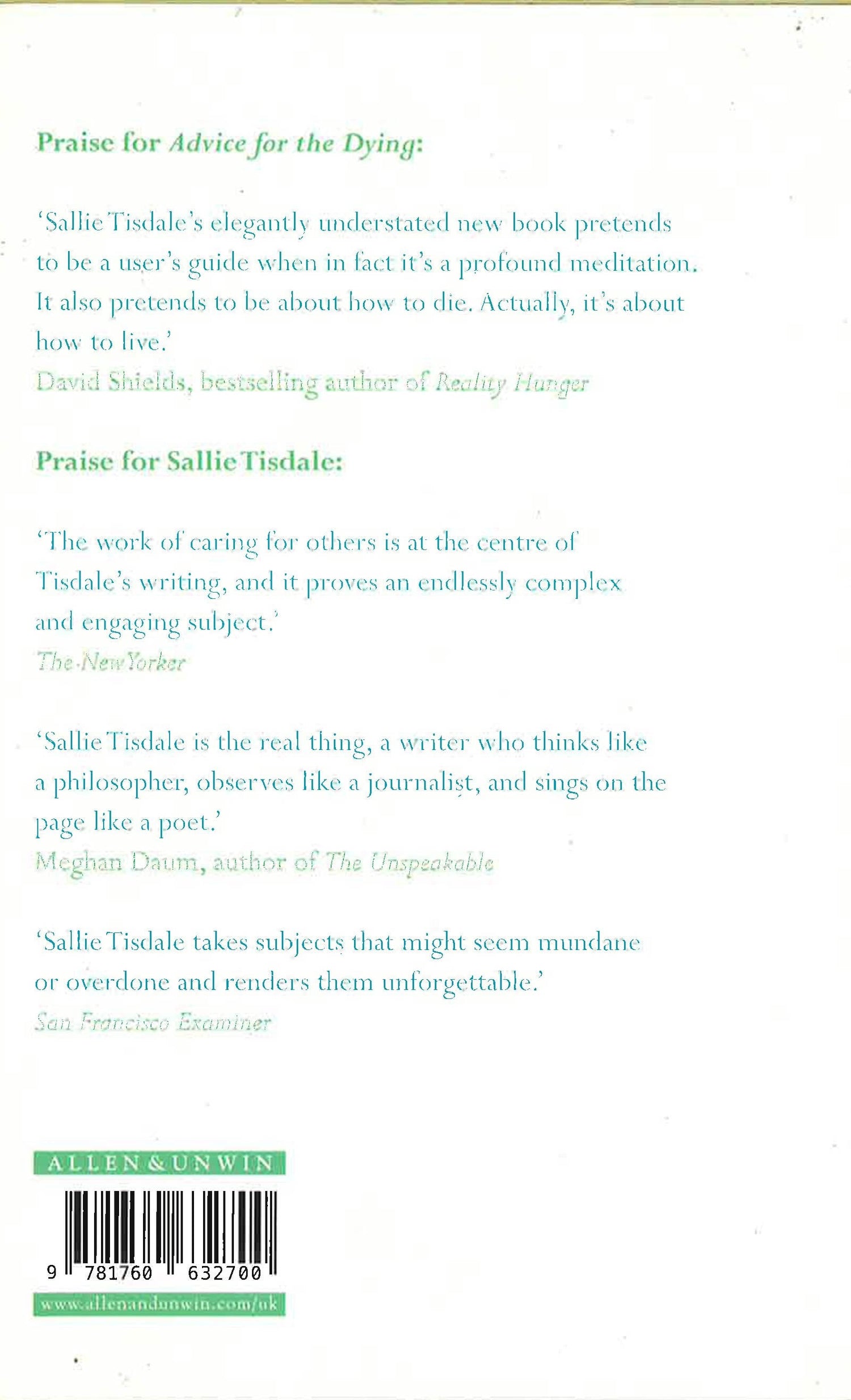 Award-winning writer and nurse Sallie Tisdale offers a lyrical, thought-provoking yet practical perspective on death and dying in this frank, direct and compassionate meditation on the inevitable. _______________________________________ From the sublime (the faint sound of Mozart as you take your last breath) to the ridiculous (lessons on how to close the sagging jaw of a corpse), Tisdale leads the reader through the peaks and troughs of death with a calm, wise and humorous hand. More than a how-to manual or a spiritual bible, this is a graceful compilation of honest and intimate anecdotes based on the deaths Tisdale has witnessed in her work and life, as well as stories from cultures, traditions and literature around the world. Tisdale explores all the heartbreaking, beautiful, terrifying, confusing, absurd and even joyful experiences that accompany the work of dying, including: A good death: What does it mean to die 'a good death'? Can there be more than one kind? What can I do to make my death, or the deaths of my loved ones, good? Communication: What to say and not to say, what to ask and when, from the dying, loved ones, doctors and more. Last months, weeks, days and hours: What you might expect, physically and emotionally, including the limitations, freedoms, pains and joys of this unique time. Bodies: What happens to a body after death? What options are available to me after my death, and how do I choose - and make sure my wishes are followed? Grief: 'Grief is a story that must be told, over and over. . . Grief is the breath after the last one.' Beautifully written and compulsively readable, Advice for the Dying offers the resources and reassurance that we all need for planning the ends of our lives. It is essential reading for all of us.