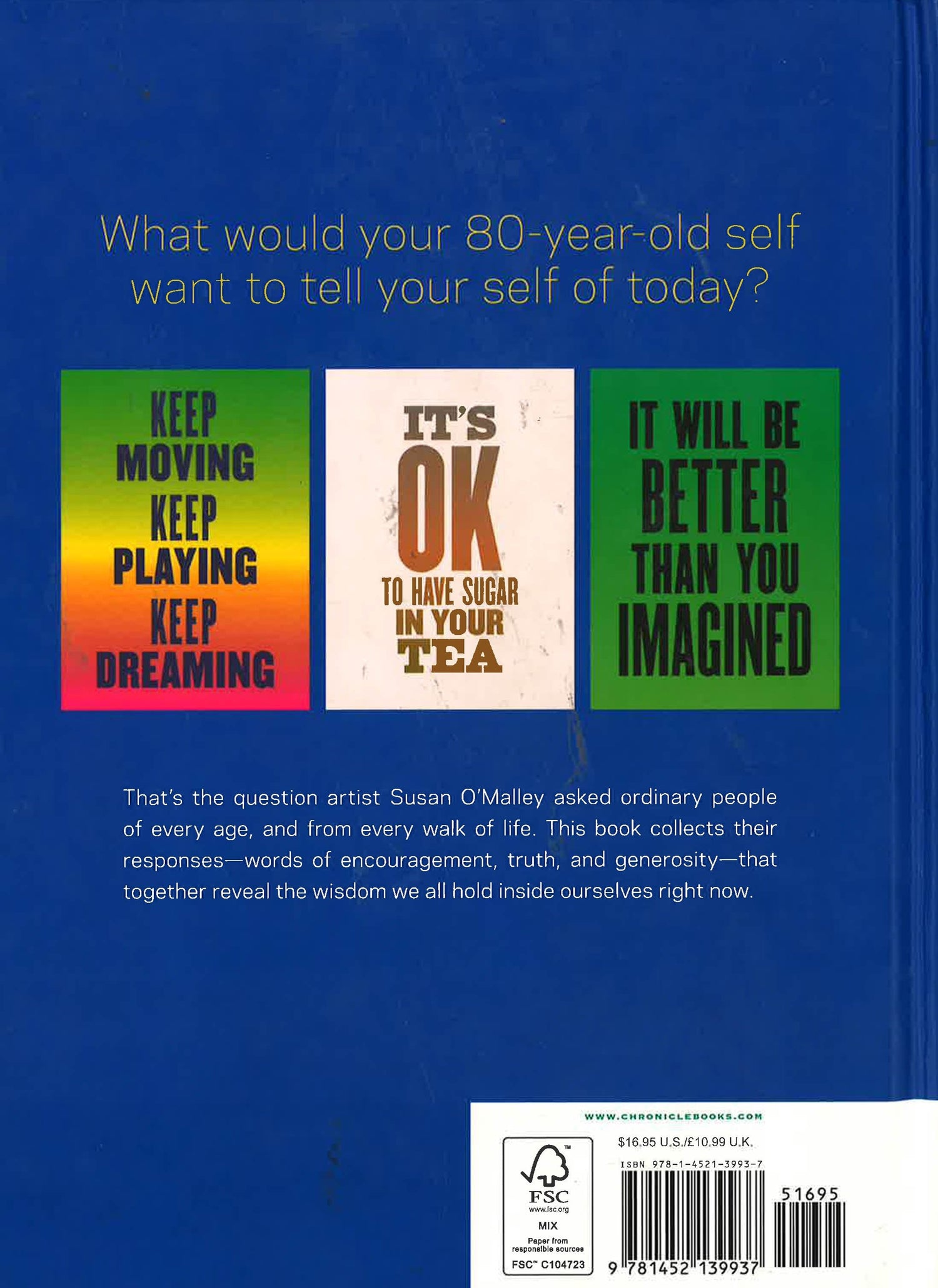 What advice would your 80-year-old self give you? That is the question artist Susan O'Malley, who was herself to die far too young, asked more than a hundred ordinary people of every age, from every walk of life. She then transformed their responses into vibrant text-based images. From a prompt to do things that matter to your heart, to a reminder that it's okay to have sugar in your tea, these are calls to action and words to live by - heartfelt, sometimes humorous, and always fiercely compassionate. This stirring celebration of our collective humanity unveils the wisdom we hold inside ourselves right now.